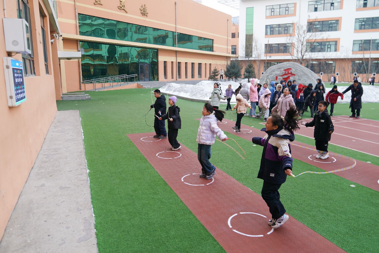 3月18日,学生运用智慧体育设备进行跳绳,该设备通过人脸识别采集运动影像并实时生成AI分析报告。