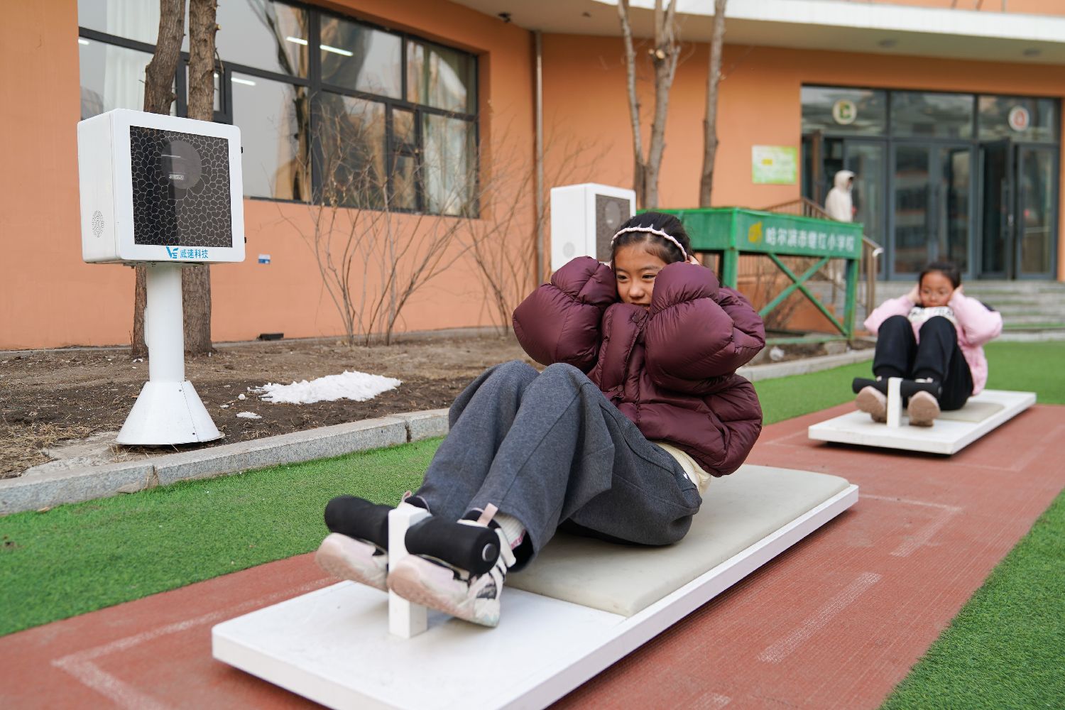 3月18日,学生运用智慧体育设备进行仰卧起坐,该设备通过人脸识别采集运动影像并实时生成AI分析报告。