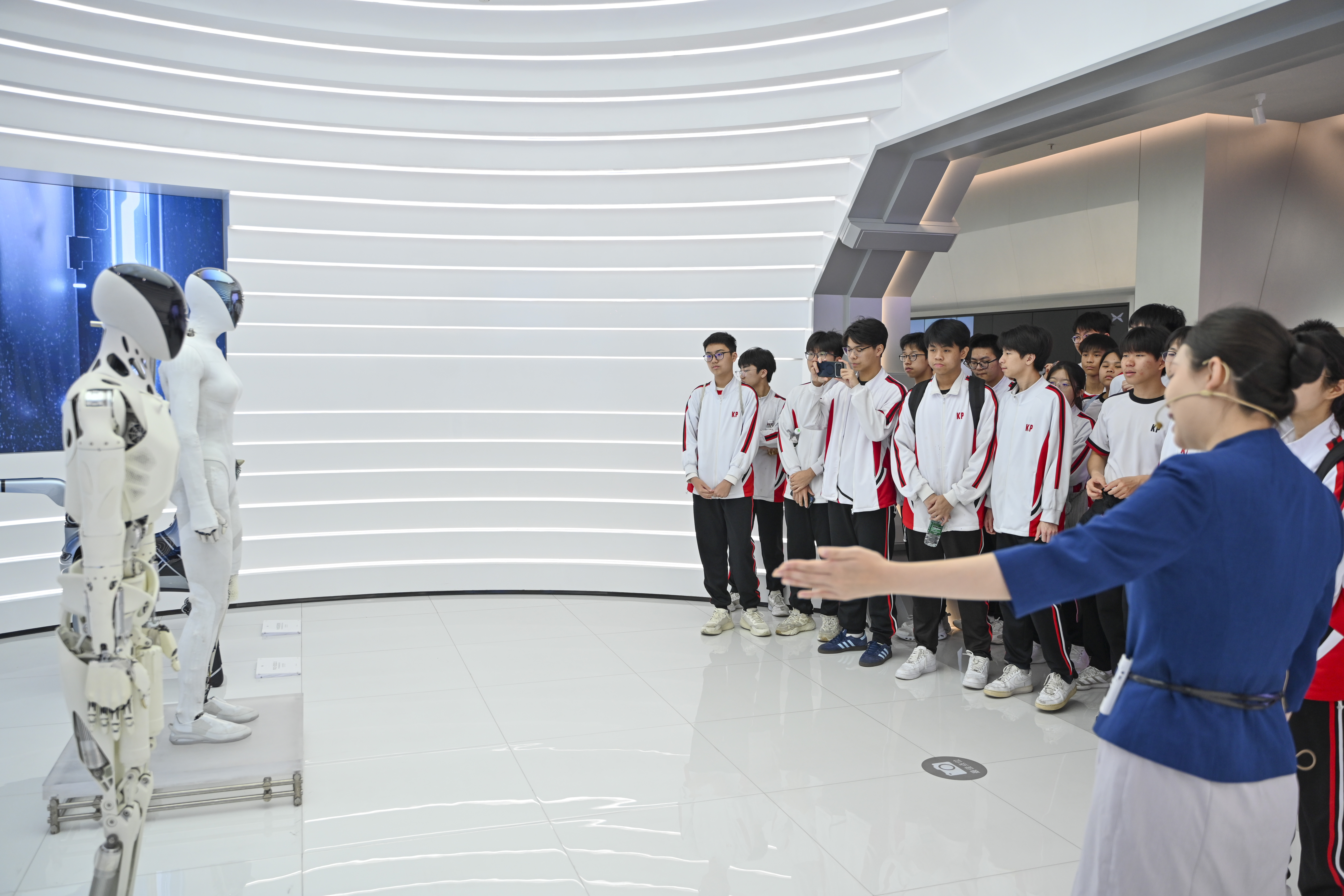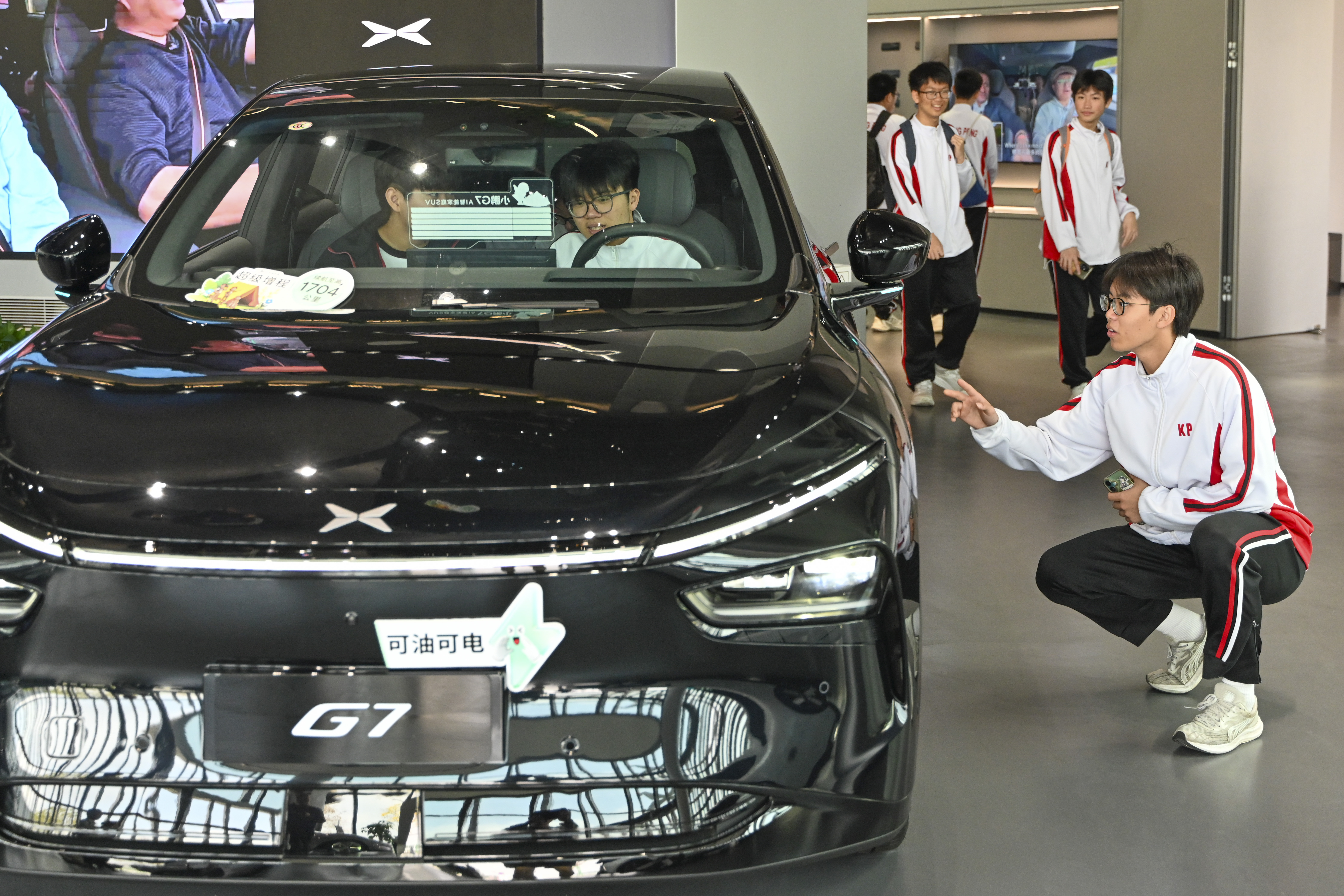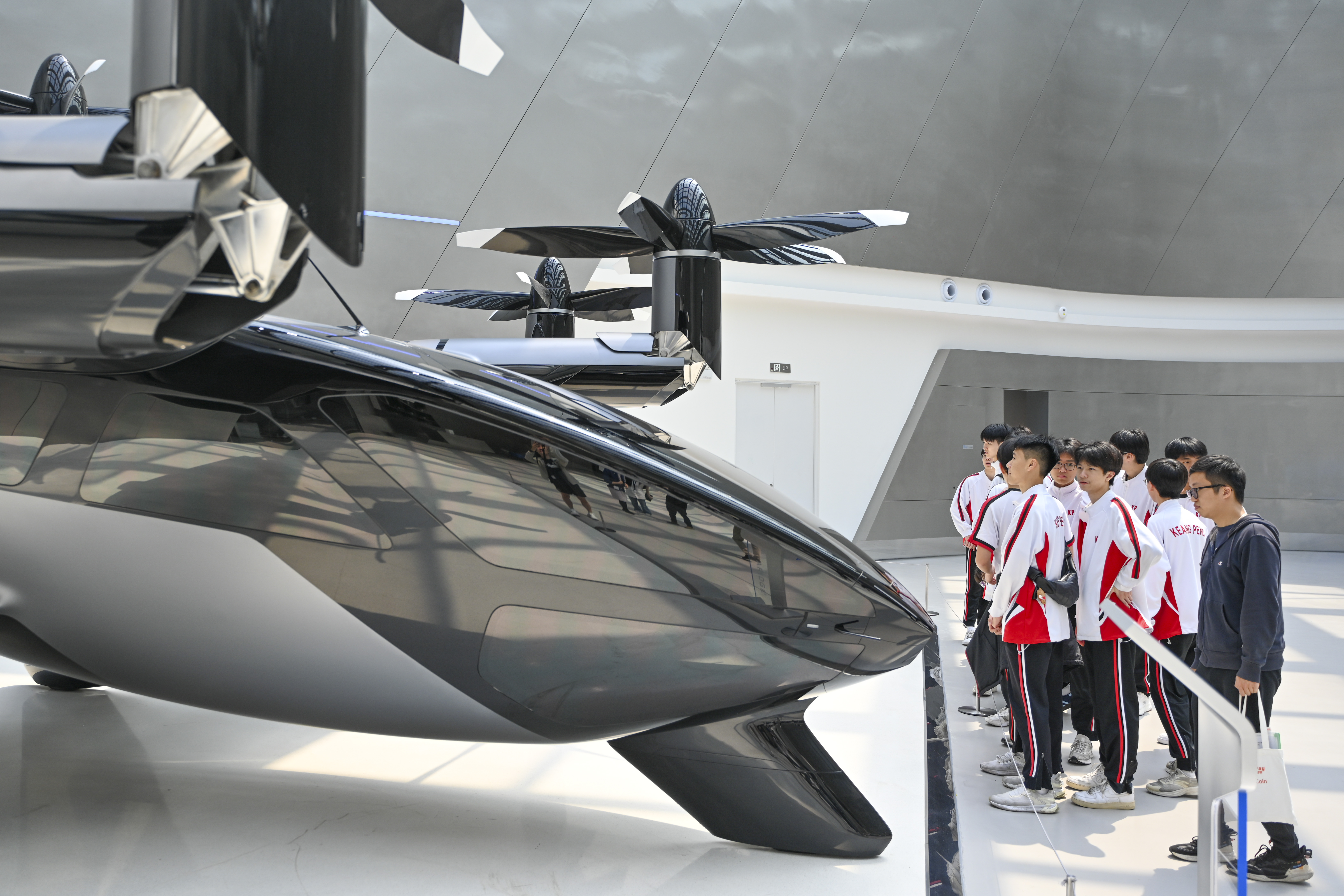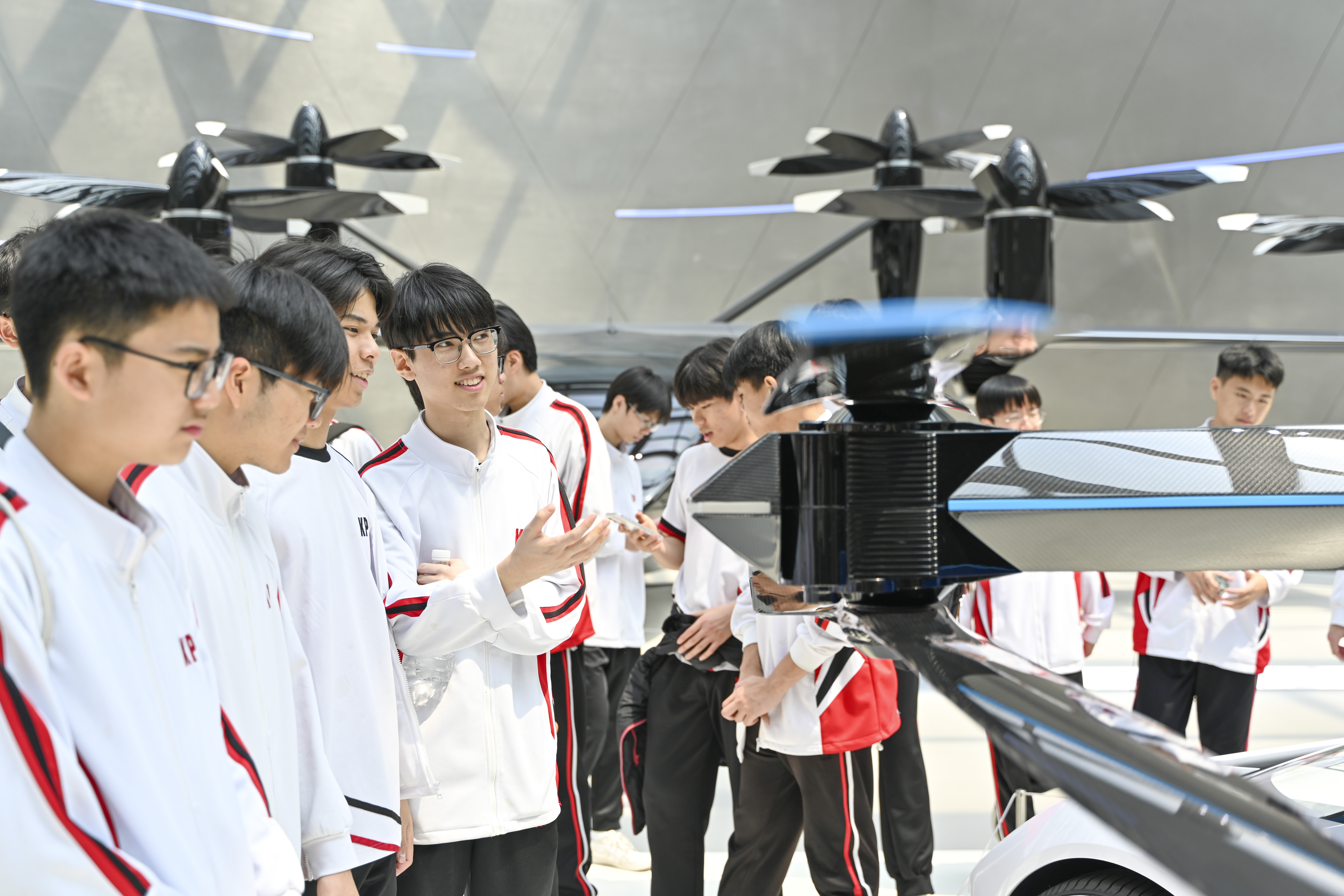3月18日,来自澳门镜平学校的师生走进位于广东广州的小鹏科技园,实地参观智能新能源汽车、飞行汽车、无人驾驶及智能机器人等一系列科创成果,近距离感受未来科技力量。图为镜平学校学生观摩飞行汽车。(图片来源:本文图片均来自中新社)