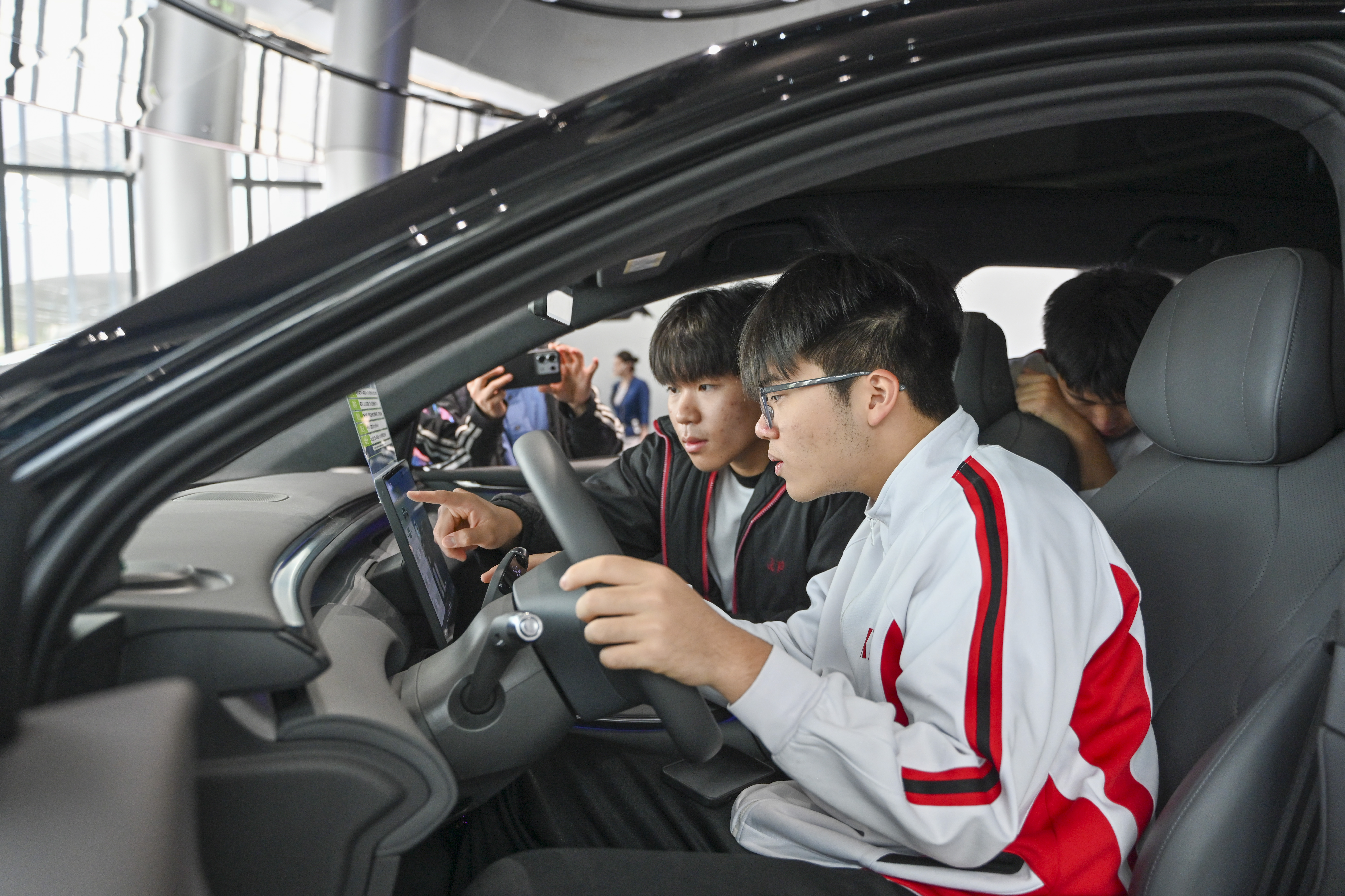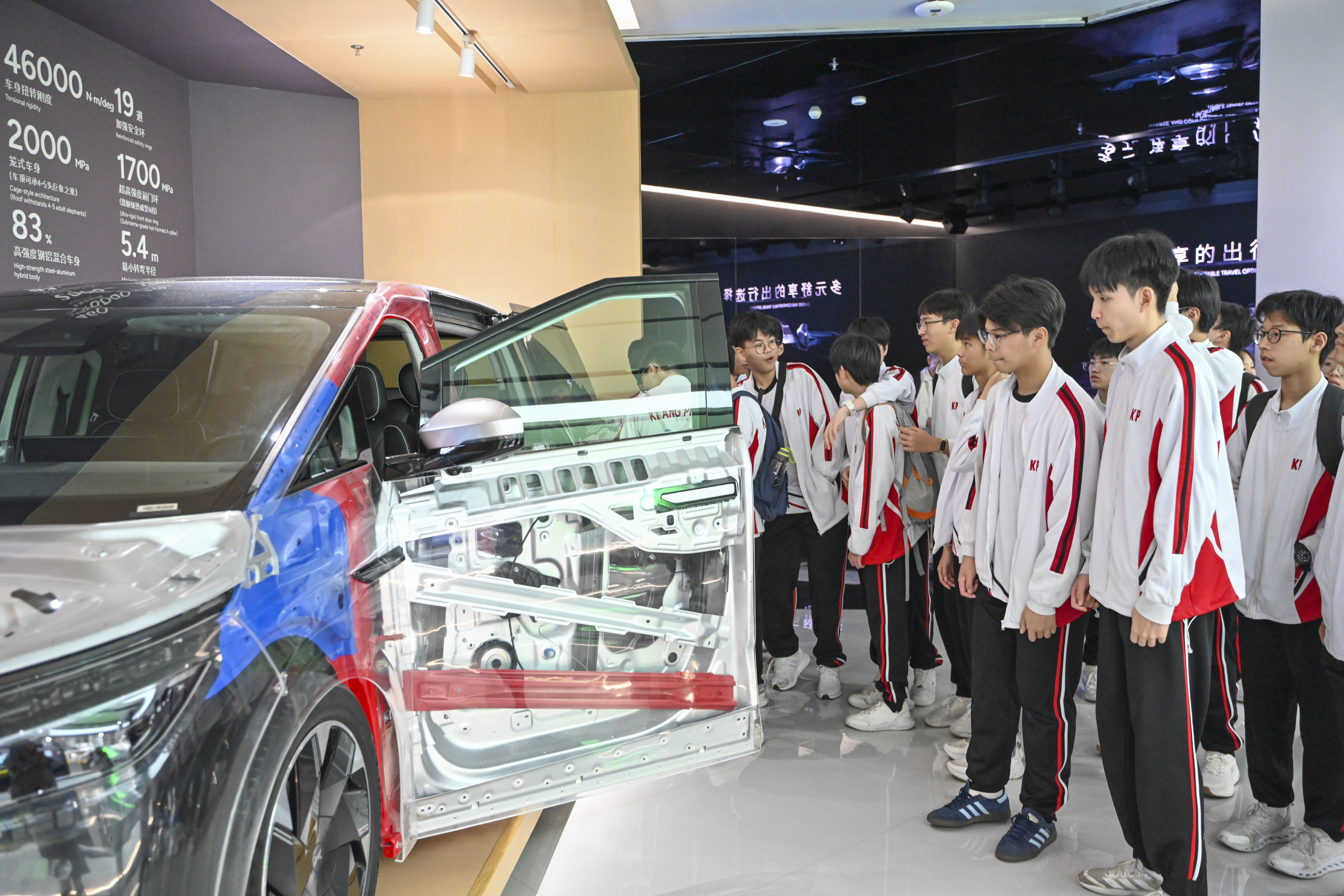 图为镜平学校学生观摩智能新能源汽车。