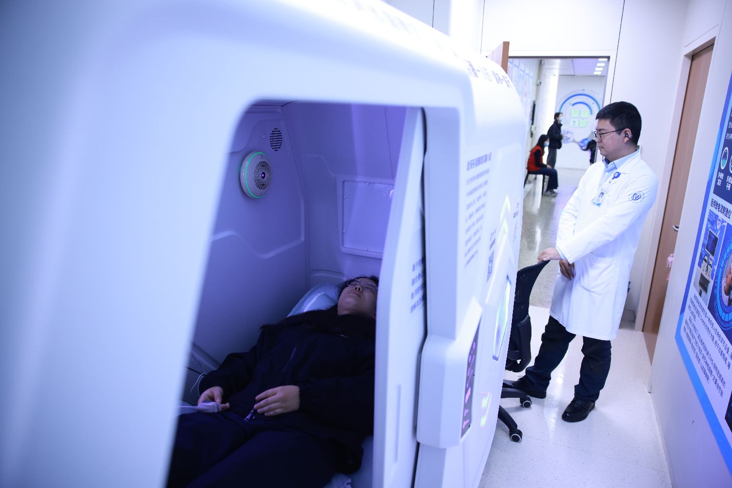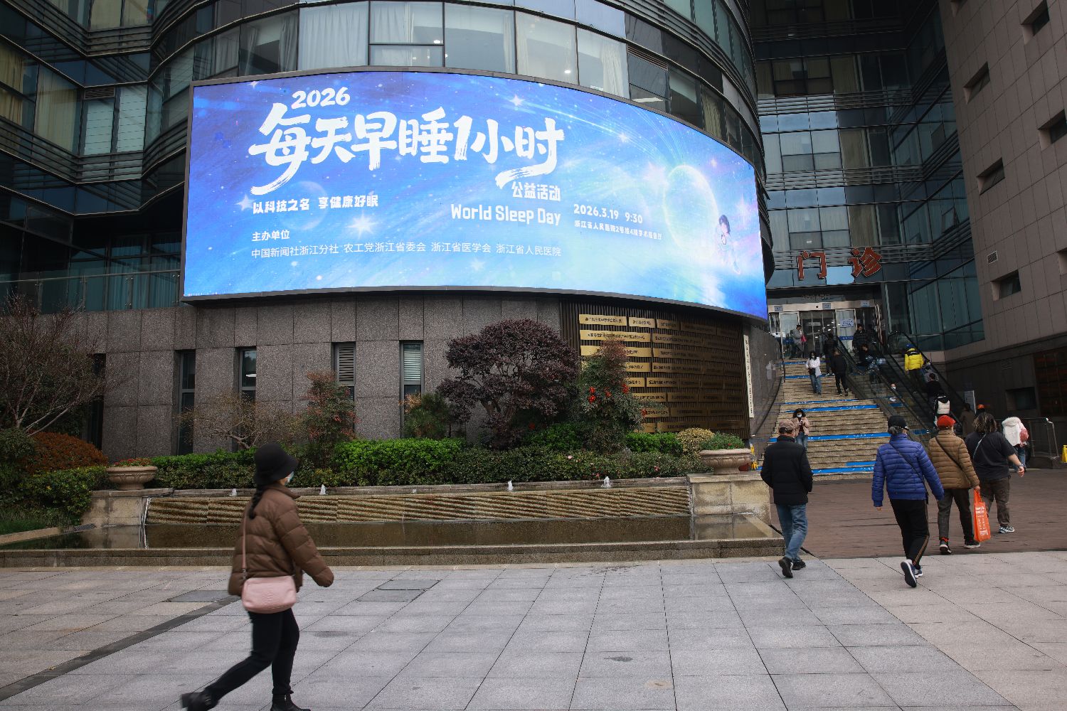 3月19日,在浙江杭州,浙江省人民医院大屏幕展示着2026“每天早睡一小时”公益活动信息。在世界睡眠日即将到来之际,浙江省人民医院配备脑机接口慢波深睡调养系统的“睡眠小屋”亮相,吸引民众体验“科技助眠”。(图片来源:本文图片均来自中新社)