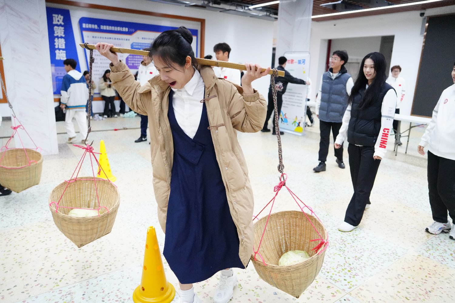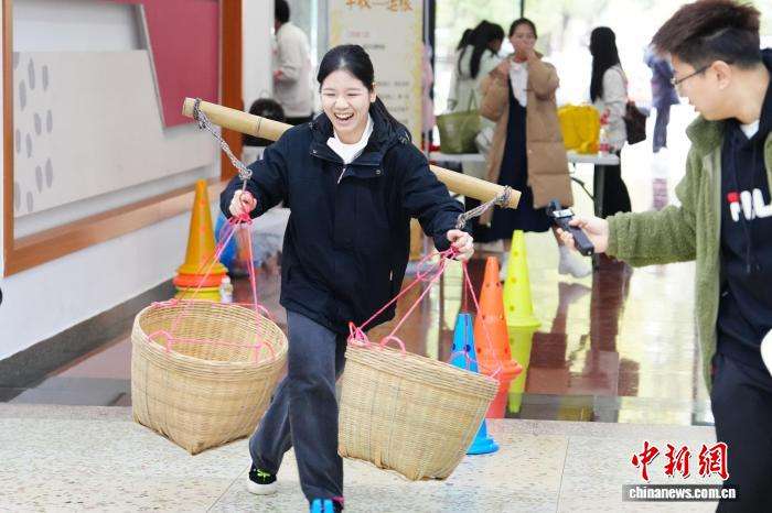 图为3月19日,大学生进行挑蔬菜比赛。(图片来源:中新网)
