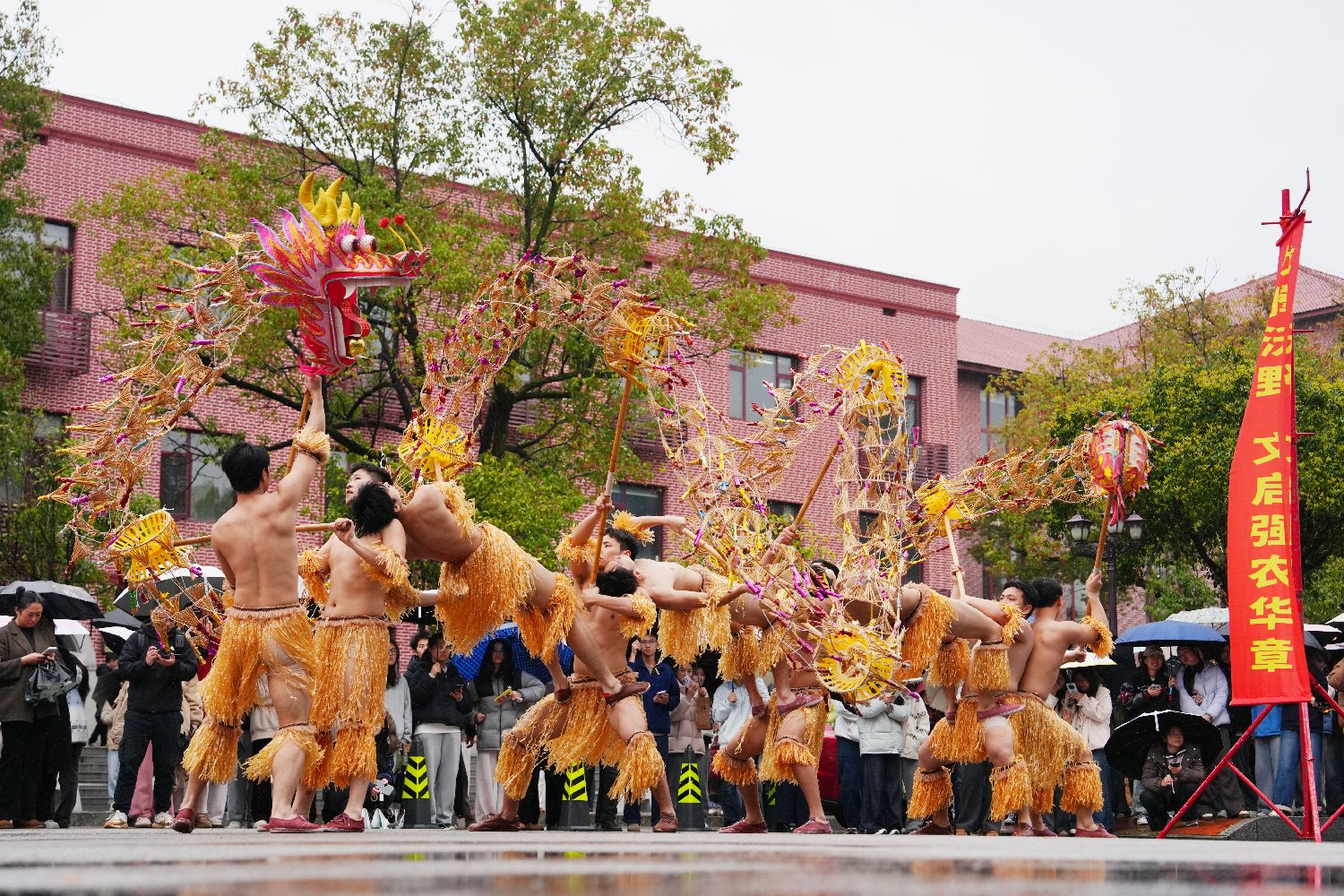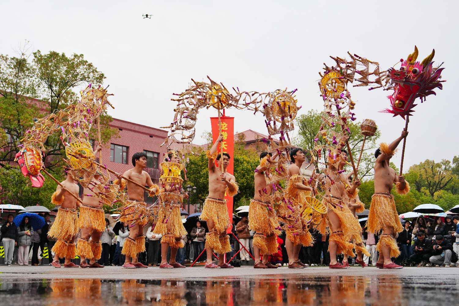 图为3月19日,大学生进行舞草龙表演。(图片来源:中新社)