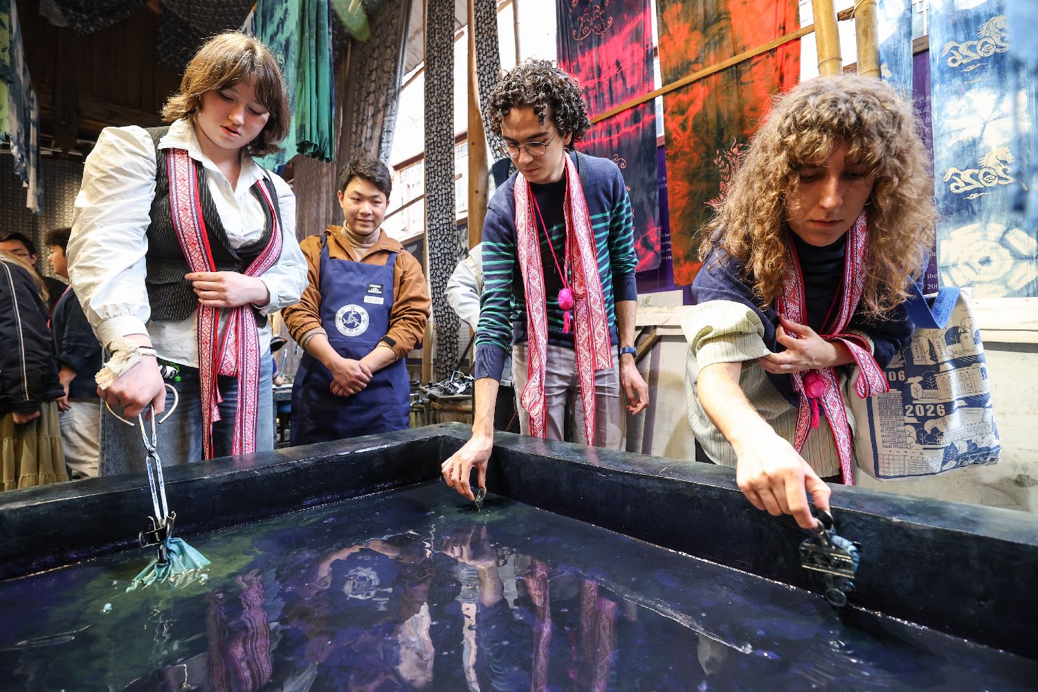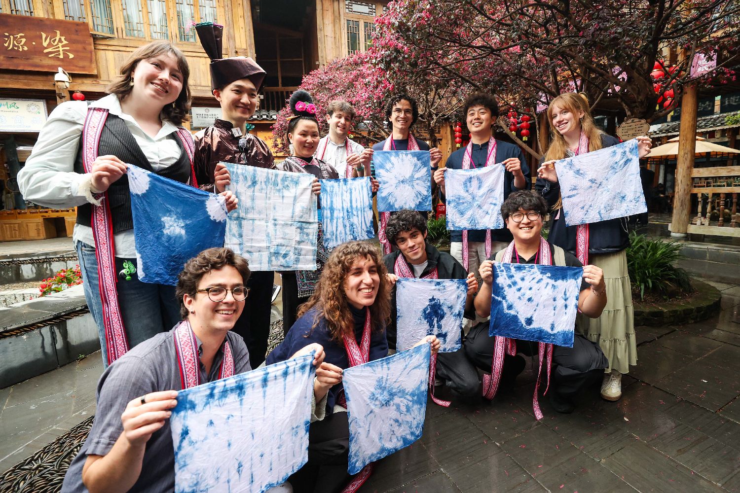 3月23日,耶鲁大学Whiffenpoofs合唱团成员手拿扎染作品合影。当日,由北京大鸾翔宇慈善基金会邀请的“大鸾和鸣—耶鲁大学Whiffenpoofs合唱团2026中国公益行”,走进贵州省黔东南州黎平县肇兴侗寨。合唱团成员了解侗族文化,学习侗族乐器并体验侗族民俗。Whiffenpoofs合唱团成立于1909年,以其独特的现代无伴奏和声与高度专业化的巡演体系成为美国高校文化中极具代表性的音乐名片。(图片来源:本文图片均来自中新社)