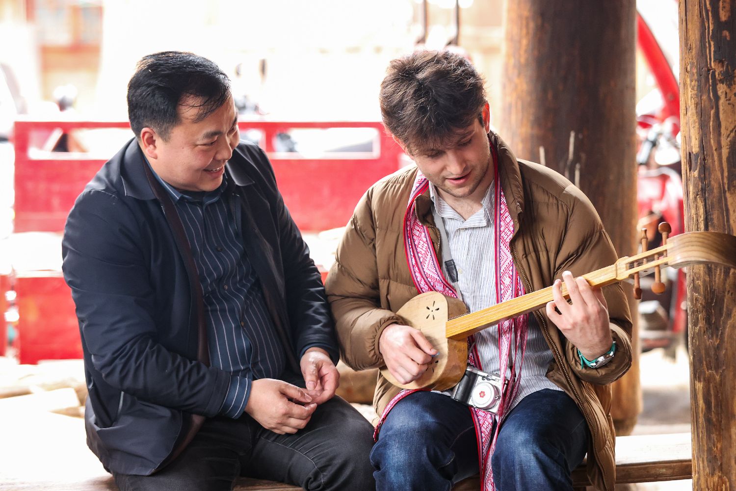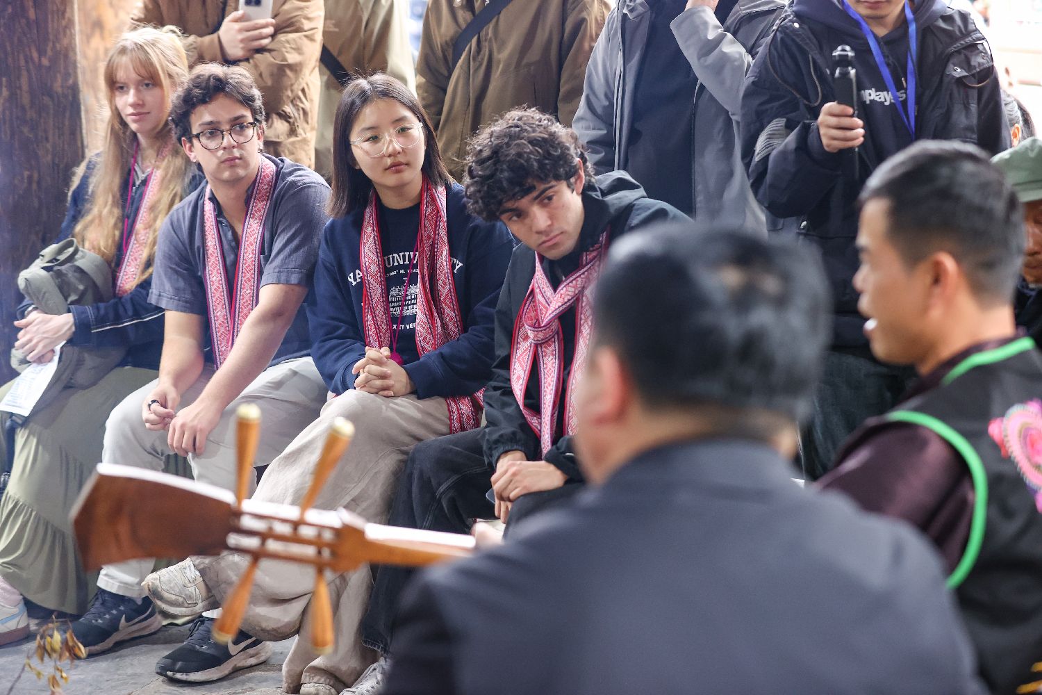 3月23日,耶鲁大学Whiffenpoofs合唱团成员学习侗族琵琶。