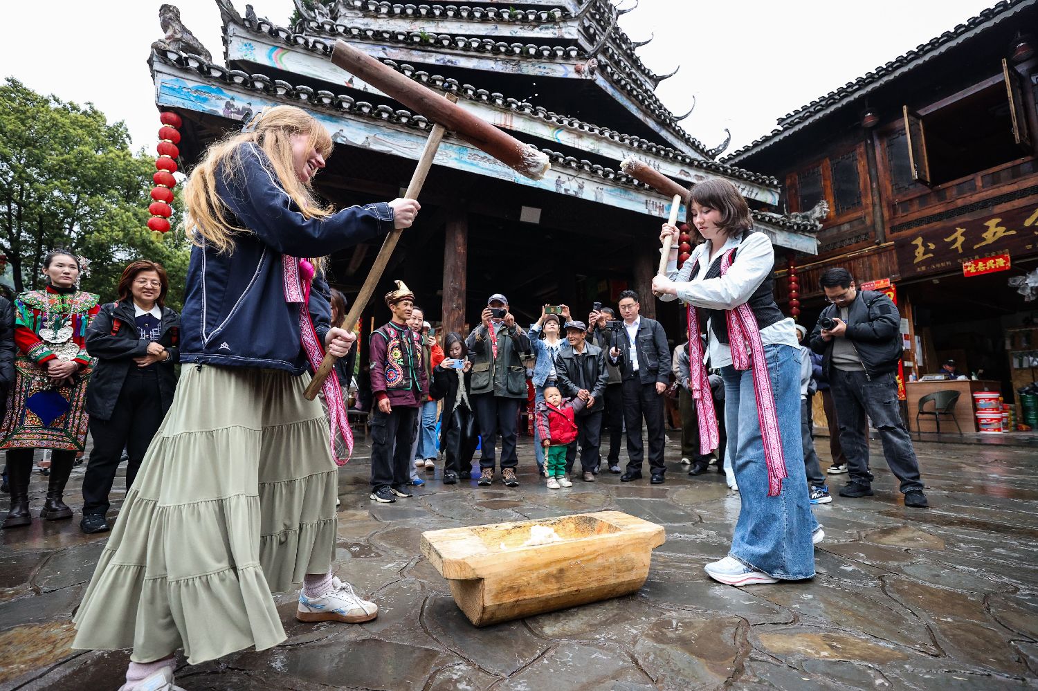 3月23日,耶鲁大学Whiffenpoofs合唱团成员体验打糍粑。