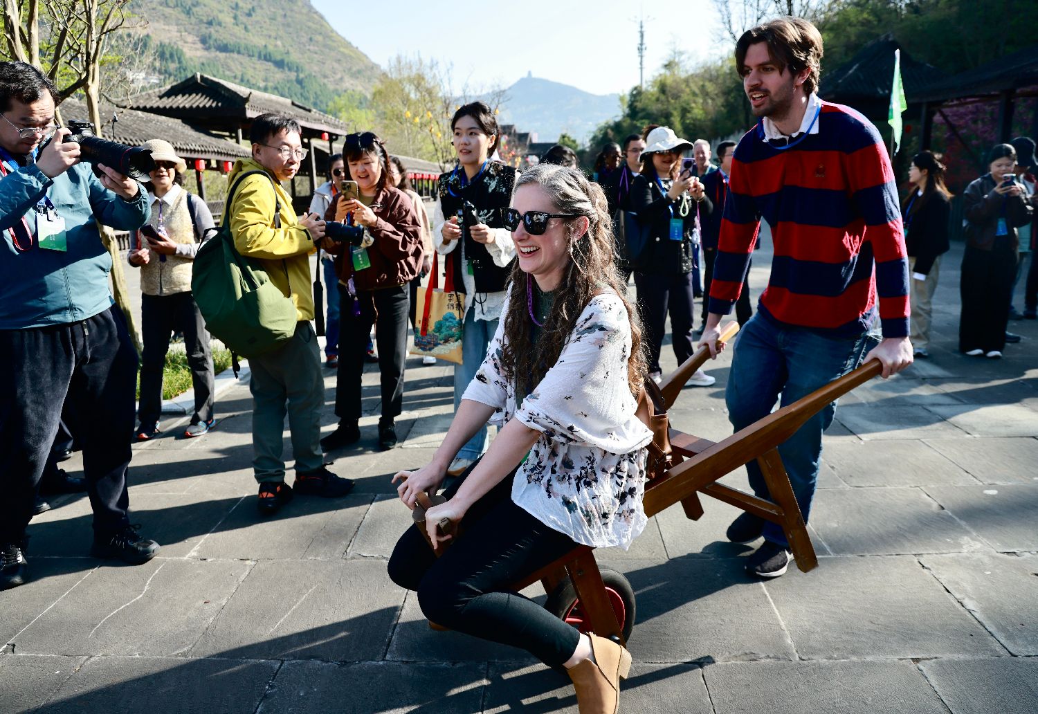 3月26日,30余位中美学者、企业代表走进中国四川省广元市,探访先秦古栈道明月峡,了解千年蜀道文化。明月峡集“嘉陵江水道、先秦栈道、金牛驿道、纤夫道、108国道、宝成铁道”等古今六道于一峡,被称为“中国道路交通历史博物馆”。图为西南大学外国语学院教师韩凯娜(坐车者)体验诸葛亮发明的“木牛流马”。(图片来源:中新社)
