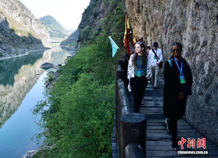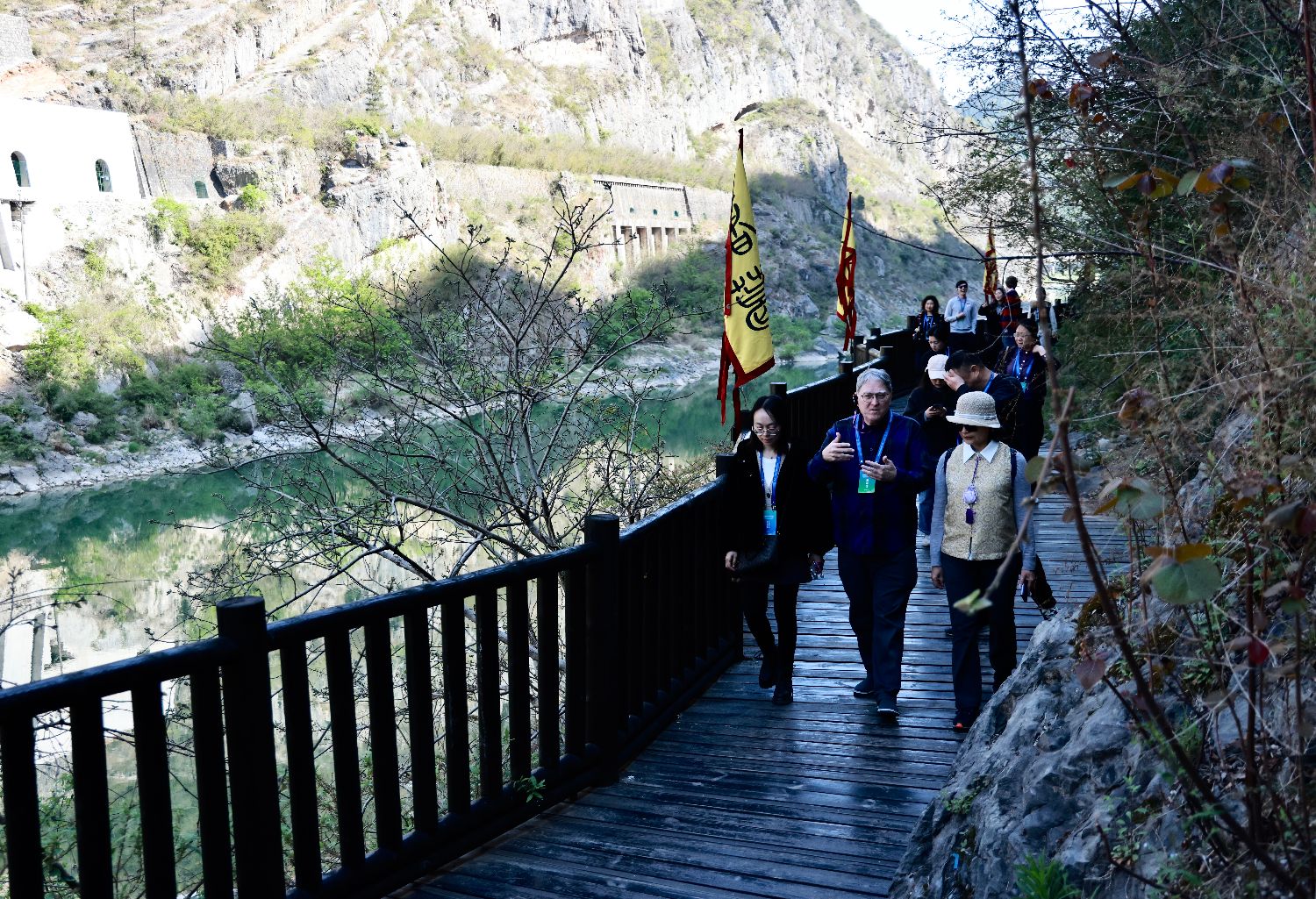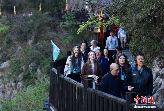 图为首都师范大学国际文化学院教授莫大伟(前左二)与同行的嘉宾在栈道上交流。(图片来源:中新社)