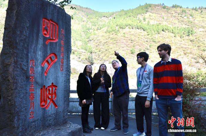 图为首都师范大学国际文化学院教授莫大伟(左三)与同行的嘉宾在明月峡参观。(图片来源:中新网)