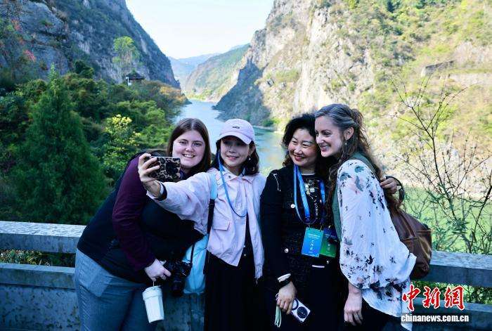 图为成都理工大学外国语学院英语系副教授崔璨(左二)与同行的嘉宾在明月峡合影。(图片来源:中新网)