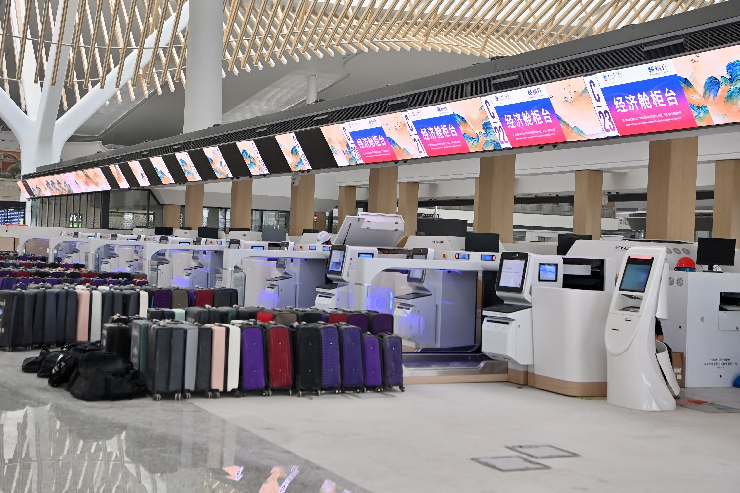 3月30日,厦门翔安国际机场内的值机柜台。位于福建省厦门市翔安区大嶝岛东南端的厦门翔安国际机场,总体规划核心区面积20.16平方公里,分三期建设,计划2026年年底通航,届时可满足年旅客吞吐量4500万人次、货邮吞吐量75万吨、飞机起降38万架次的使用需求。目前,厦门翔安国际机场已全面转入竣工验收、校飞试飞与转场筹备关键期。(图片来源:本文图片均来自中新社)