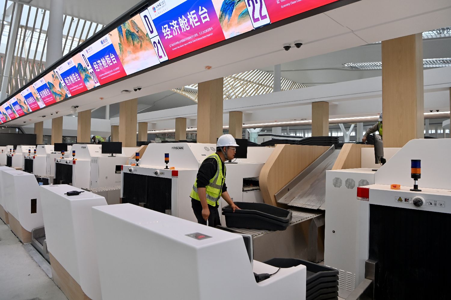 3月30日,工作人员在厦门翔安国际机场内调试设备。