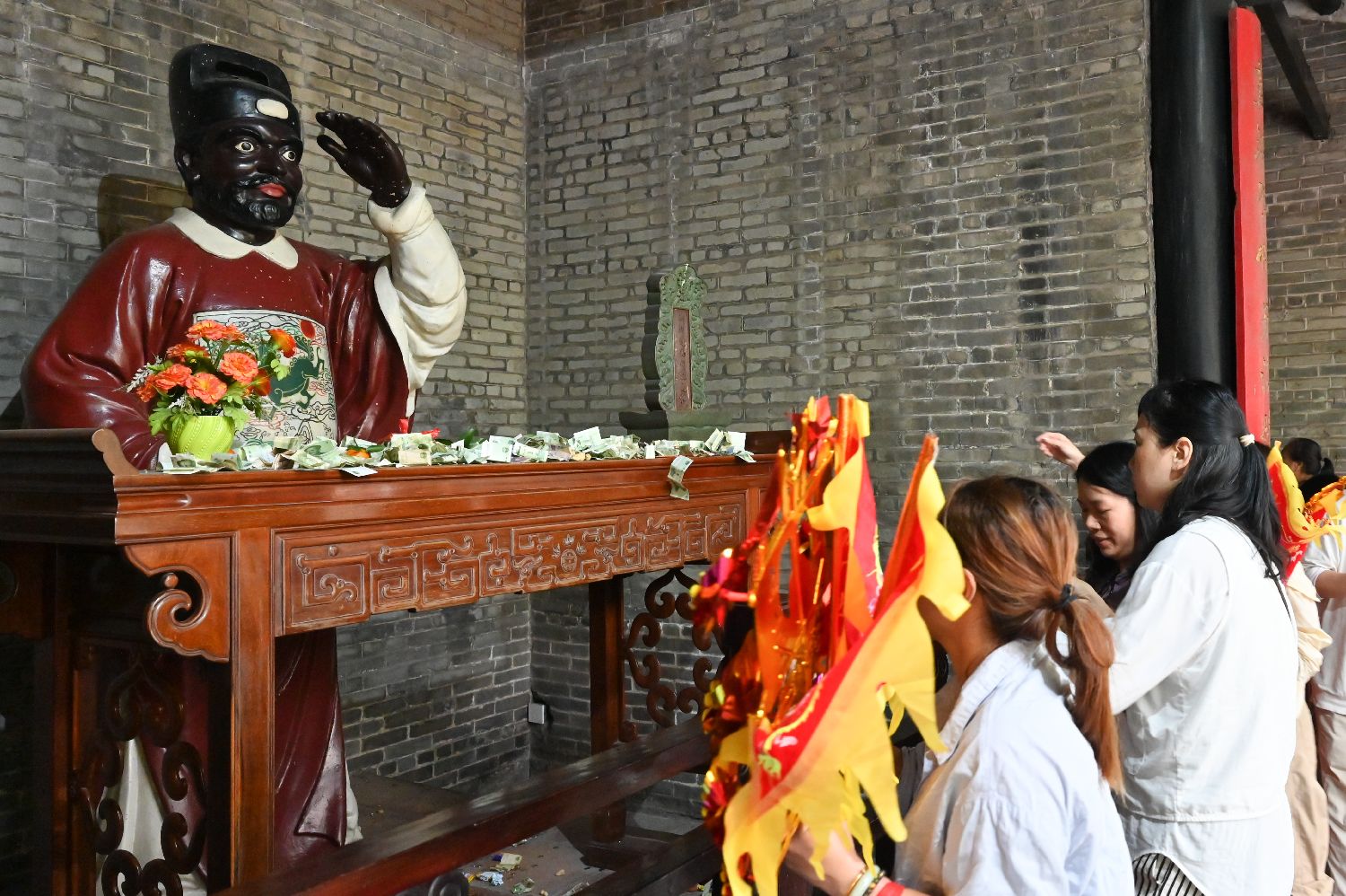 图为南海神庙的“达奚司空”神像吸引参观者。“达奚司空”是南海神庙传说中的古波罗国朝贡使,因种波罗树误船,立化庙中,被塑像祀于庙内,象征海上丝路友好往来。