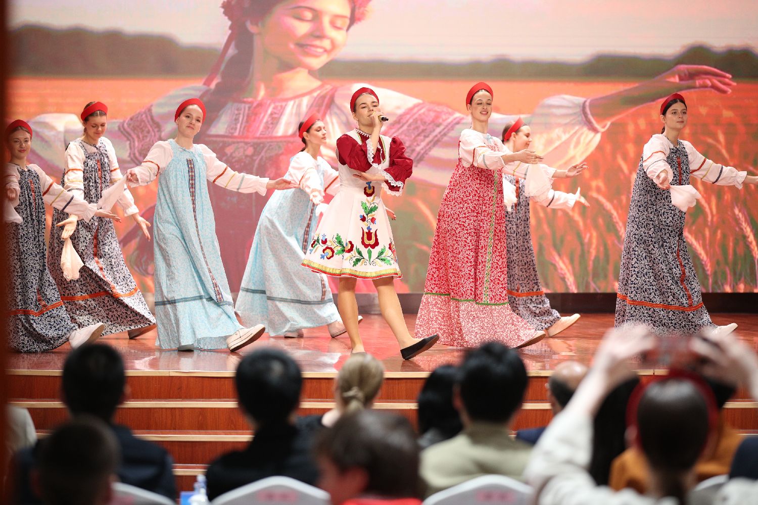 4月2日,2026中俄青少年文化艺术节开幕式在天津外国语大学举行。32名俄罗斯“小鹰”青少年访华团成员与天津外国语大学学子同台展示精彩节目,并举办中俄文化市集。图为文艺展演。(图片来源:中新社)