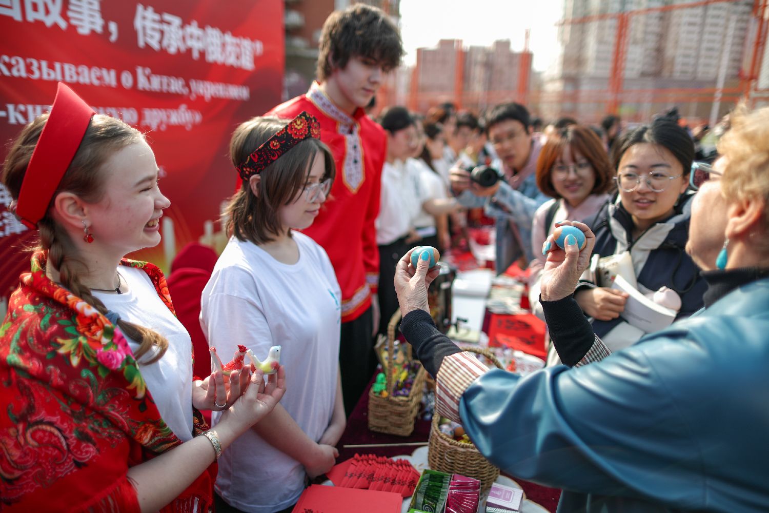 图为中俄学子参观中俄文化市集。(图片来源:中新社)