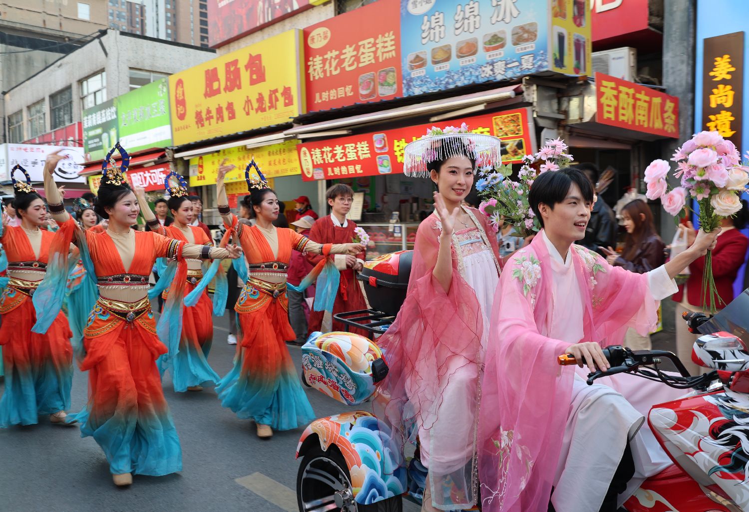4月7日,表演队伍在八大局便民市场沿街巡游,为夜间烧烤预热。