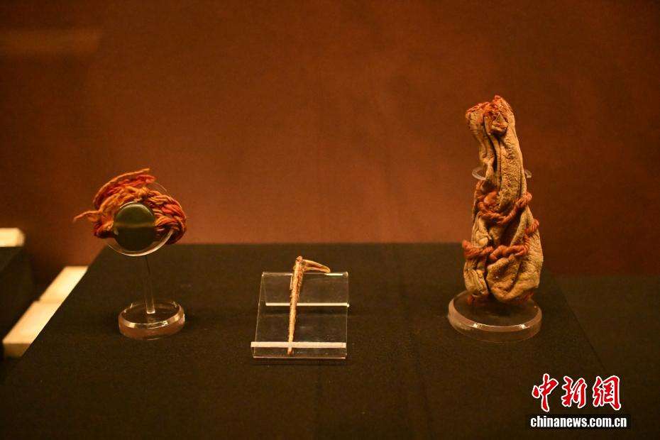 4月8日,在位于甘肃省兰州市的甘肃简牍博物馆“锦绣华裳”巴州博物馆藏古代服饰精品展展陈的青铜时期(距今约4000—3400年)手链、骨雕、皮囊。(图片来源:中新网)