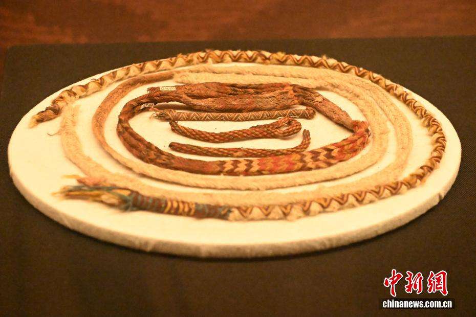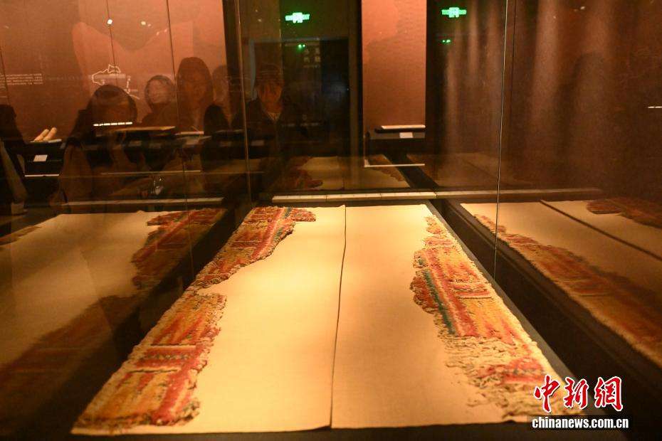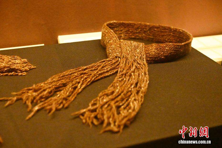 4月8日,在位于甘肃省兰州市的甘肃简牍博物馆“锦绣华裳”巴州博物馆藏古代服饰精品展展陈的早期铁器时代(距今约3000年)编织带。(图片来源:中新网)