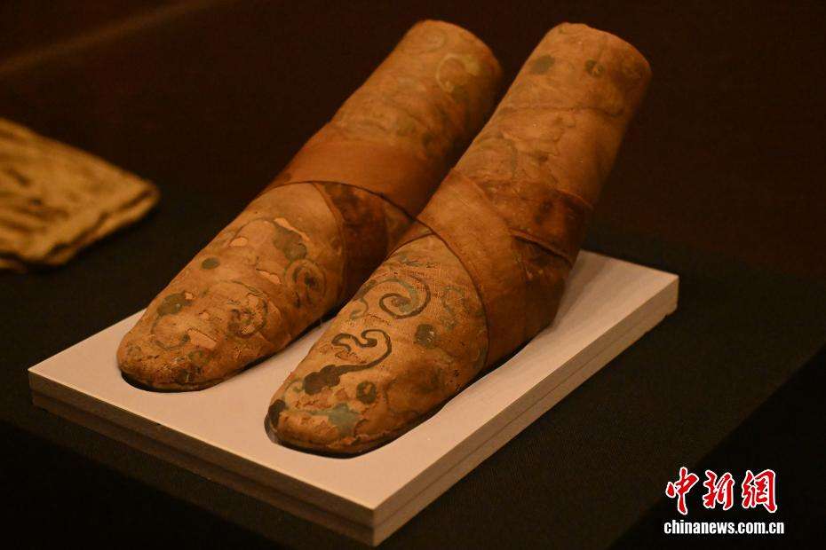 4月8日,在位于甘肃省兰州市的甘肃简牍博物馆“锦绣华裳”巴州博物馆藏古代服饰精品展展陈的东汉至晋时期云纹麻布靴。(图片来源:中新网)