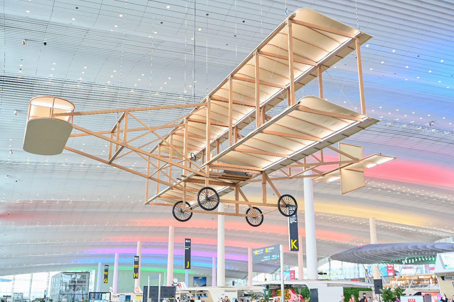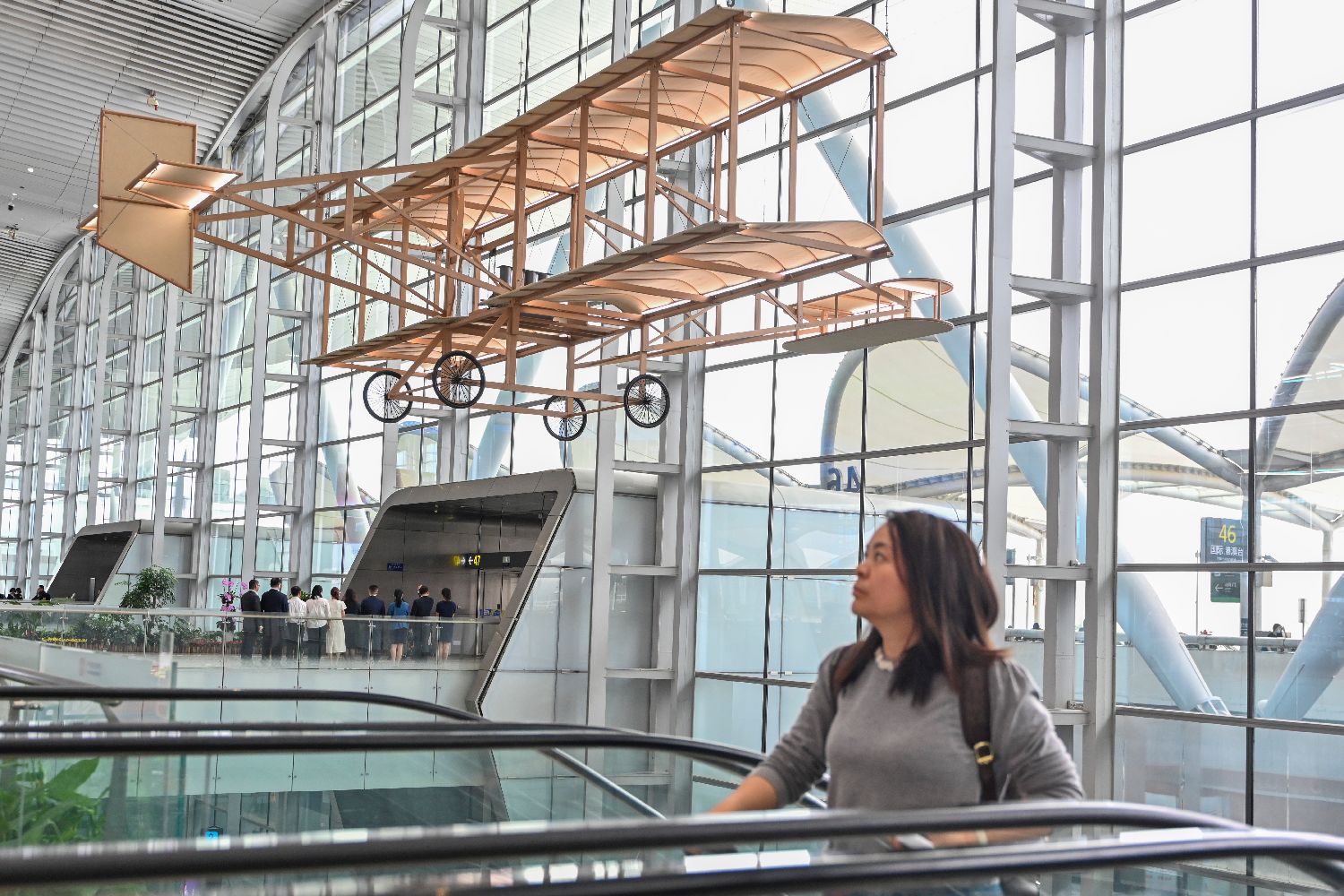 4月10日,“如·翼”主题艺术装置在广州白云国际机场T2航站楼内亮相。“如·翼”以“冯如一号”为原型打造,机身长11.2米,翼展11.5米,高3.7米,致敬中国航空先驱冯如先生于1909年驾驶“冯如一号”成功飞上天空的壮举。(图片来源:本文图片均来自中新社)
