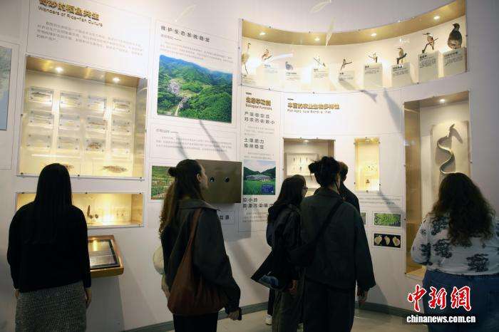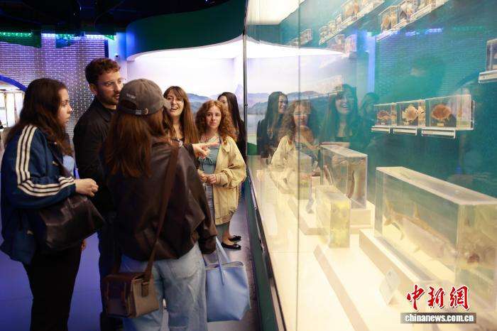图为留学生在稻鱼共生系统博物馆驻足观看瓯江水生生物标本。