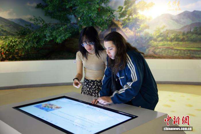 图为留学生在稻鱼共生系统博物馆多媒体互动屏前了解稻鱼共生历史。
