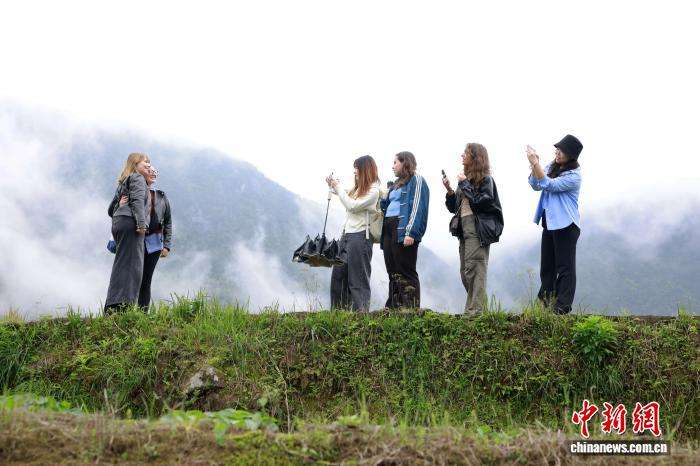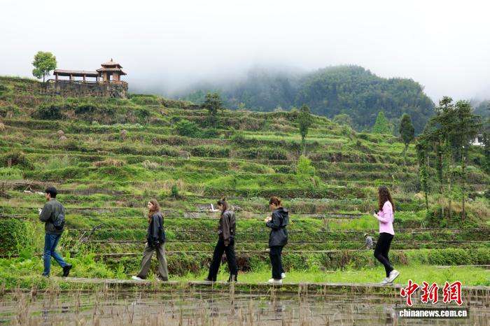 图为留学生在稻鱼共生核心保护区拍照留念。