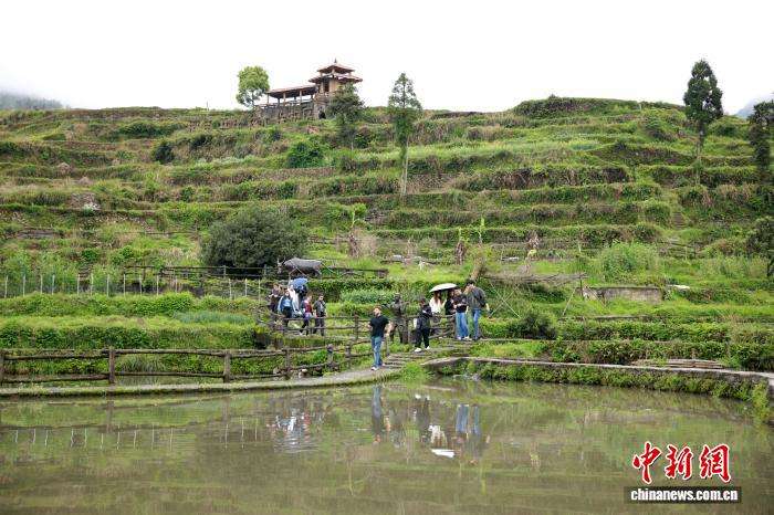 图为留学生参观稻鱼共生核心保护区。