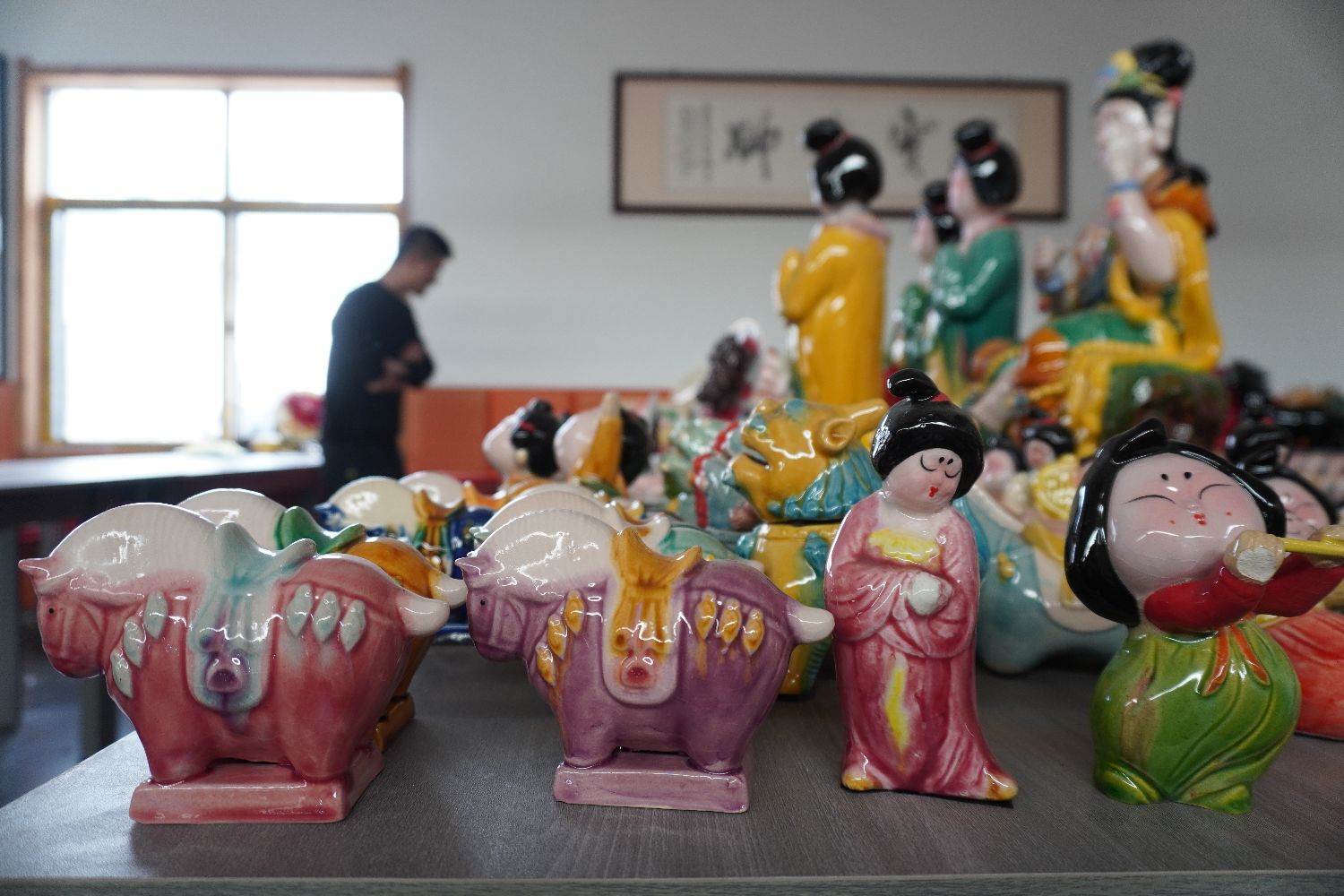 4月15日,坐落于河南省洛阳市孟津区南石山村的“三彩小镇”,各个唐三彩生产工坊内,匠人们忙于制作唐三彩器物。诞生于河洛地区的唐三彩距今已有1300余年历史,有“东方艺术瑰宝”之称,南石山村因生产唐三彩而闻名,这里汇聚70余家唐三彩生产企业,年产值3.5亿元人民币。图为各种唐三彩文创产品。(图片来源:本文图片均来自中新社)