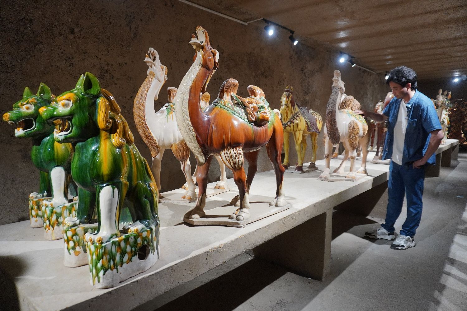 图为游客观赏唐三彩器物。