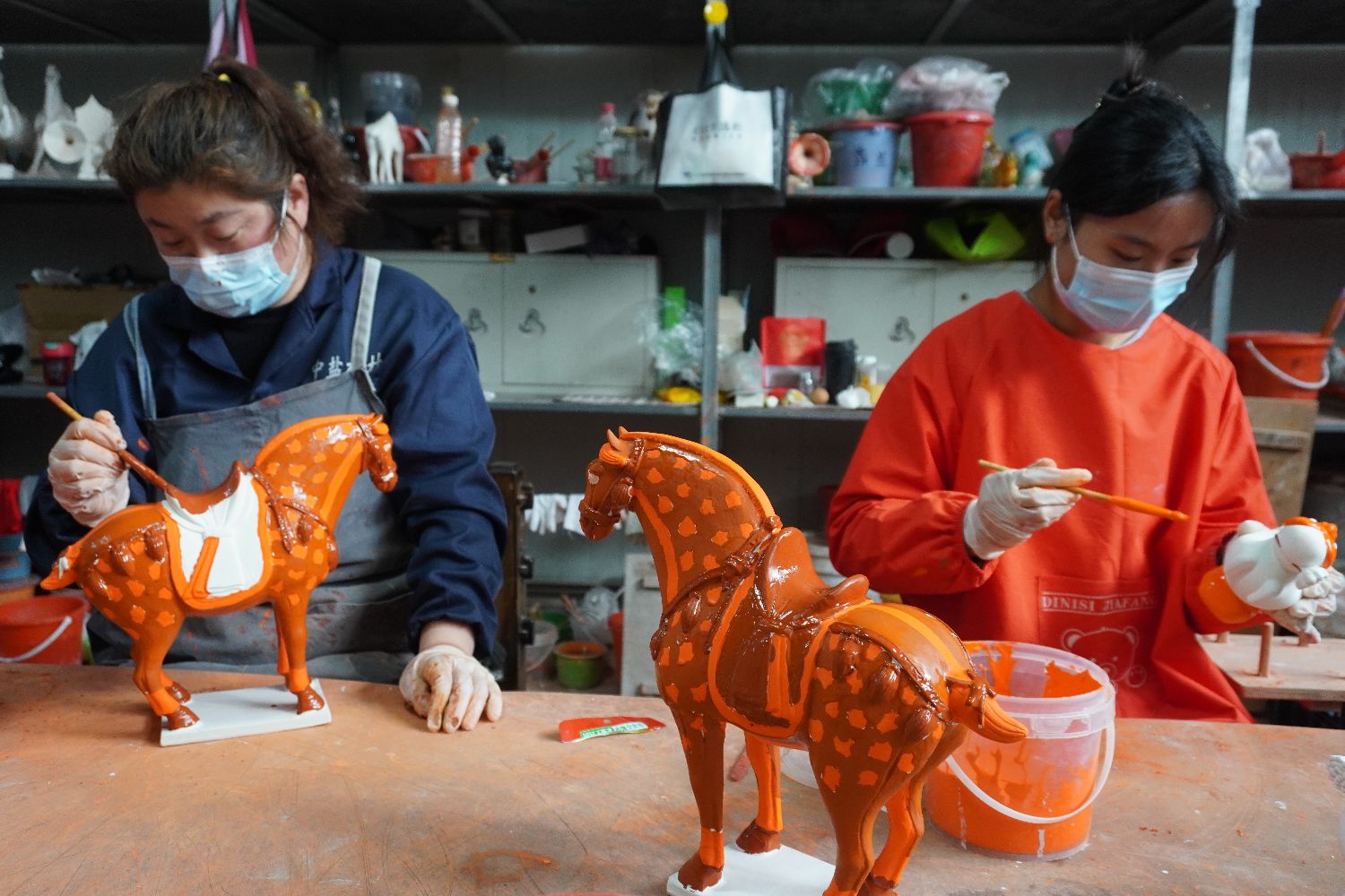 图为匠人为唐三彩马上釉料。