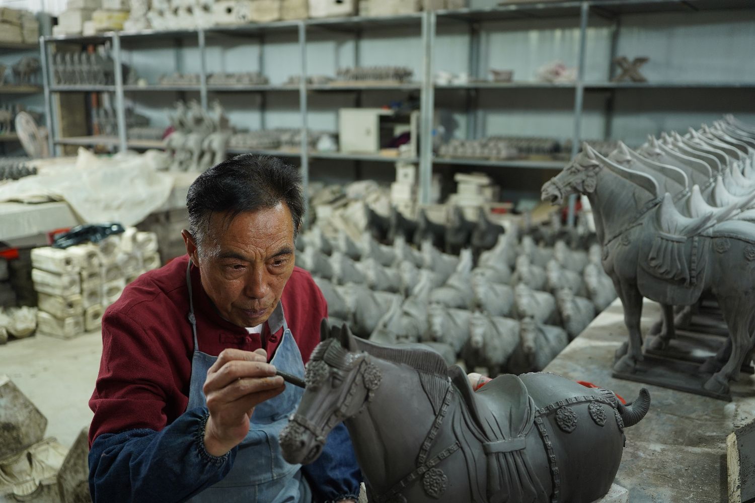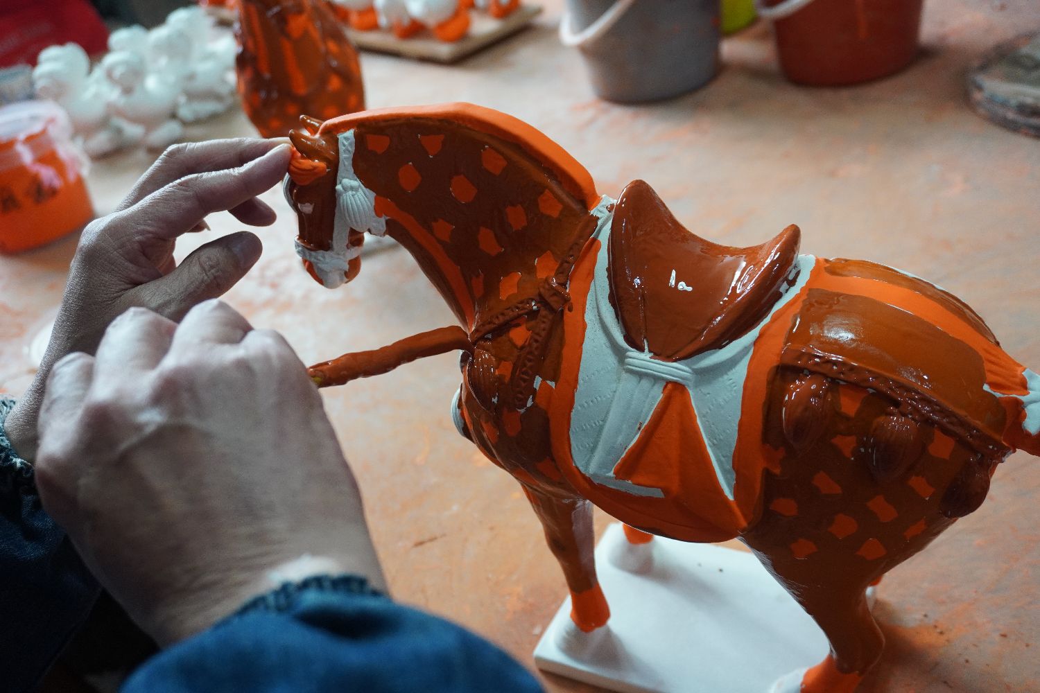 图为中国国家级非物质文化遗产项目唐三彩烧制技艺代表性传承人高水旺制作唐三彩马。