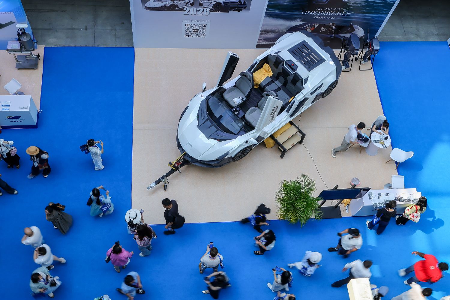 图为在水域展区展出的游艇引来参观者。