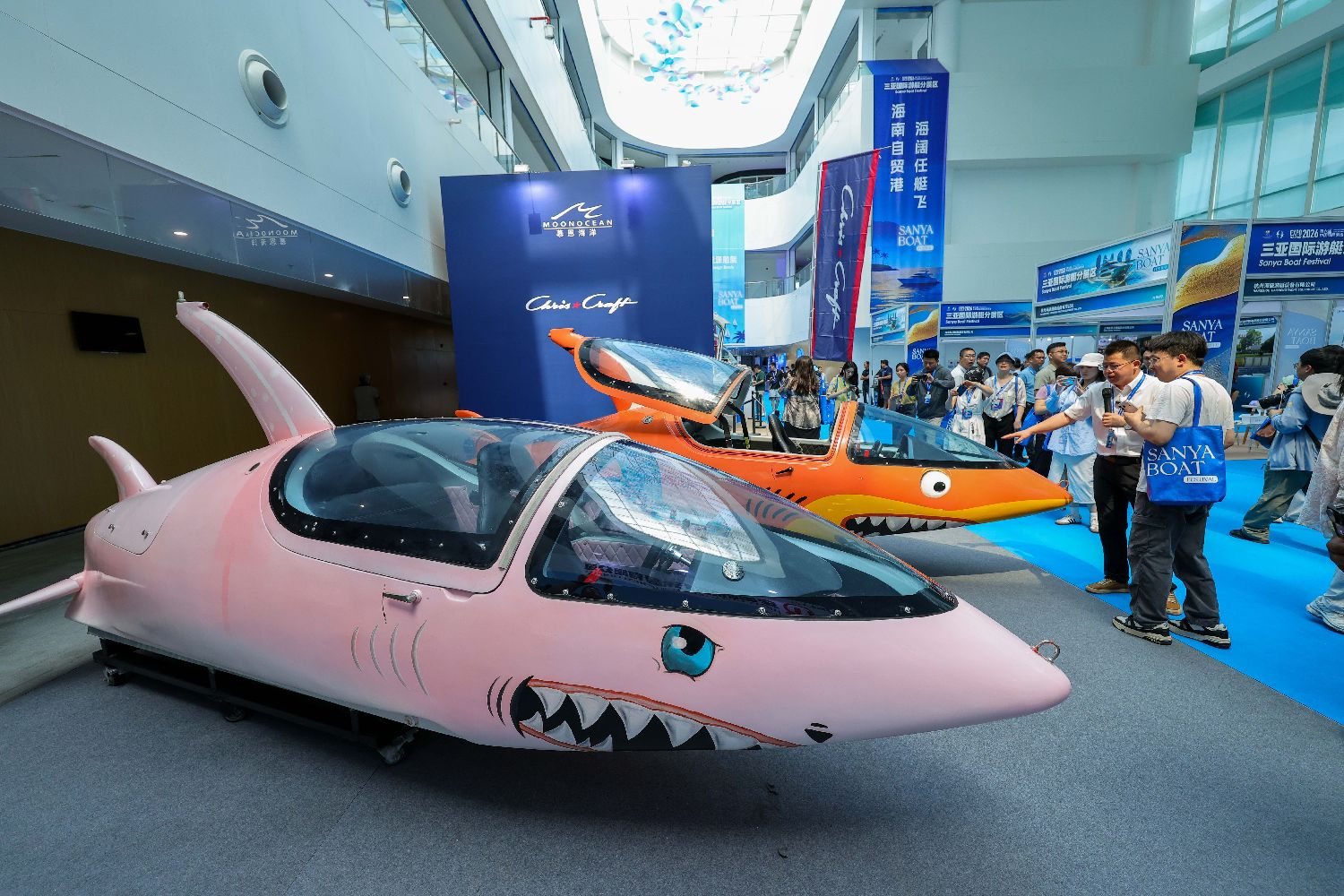 图为展出的一款鲨鱼艇引来参观者。