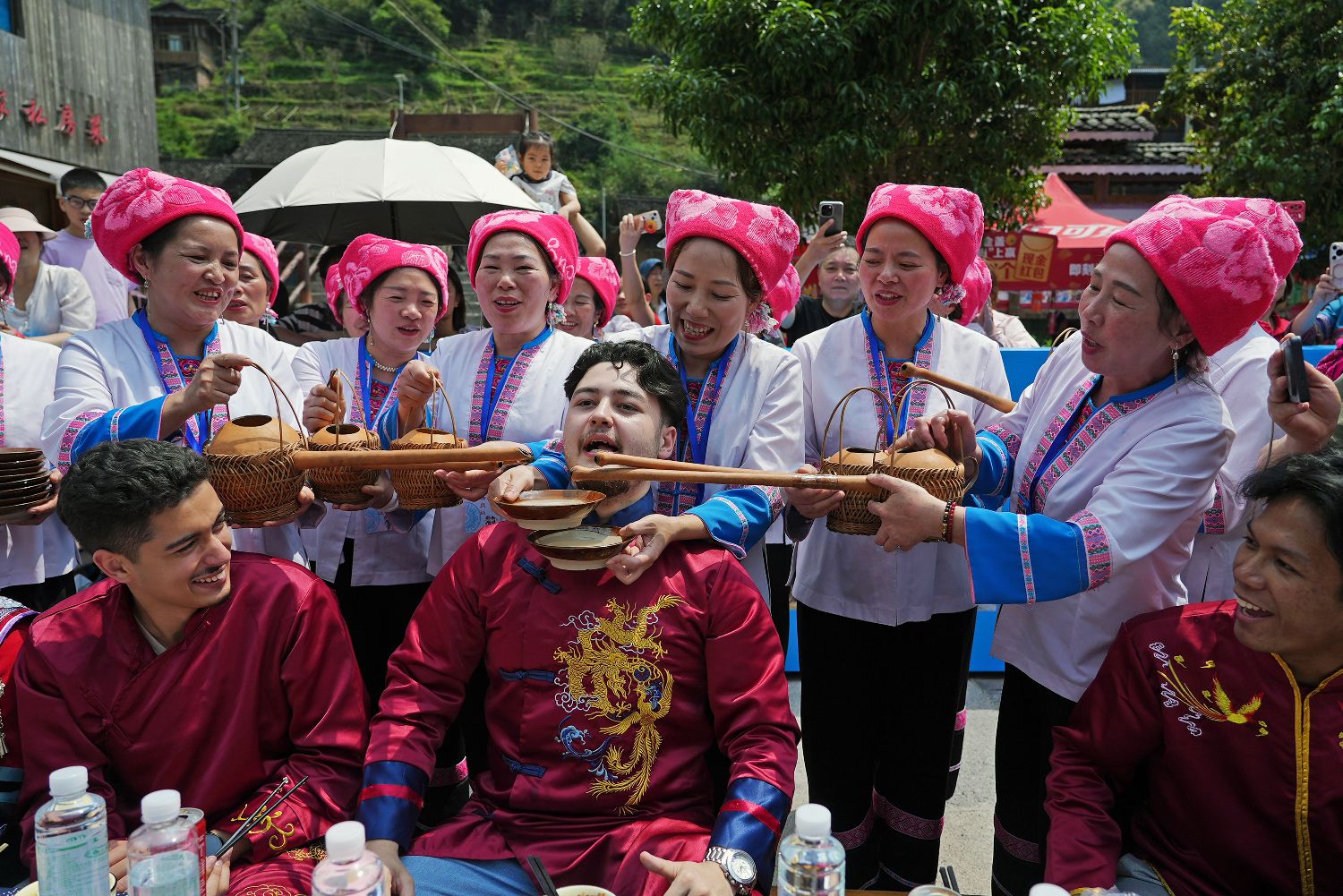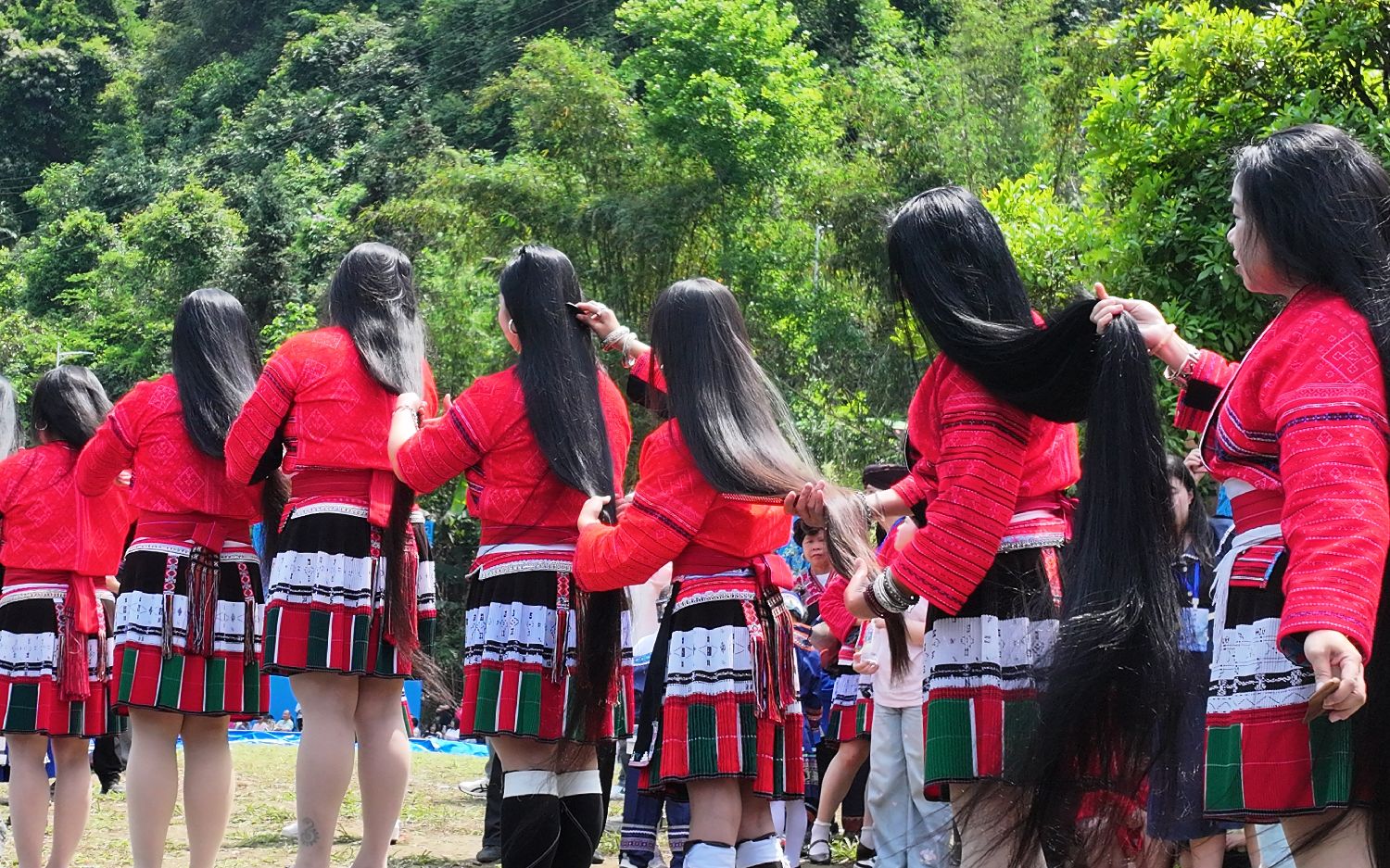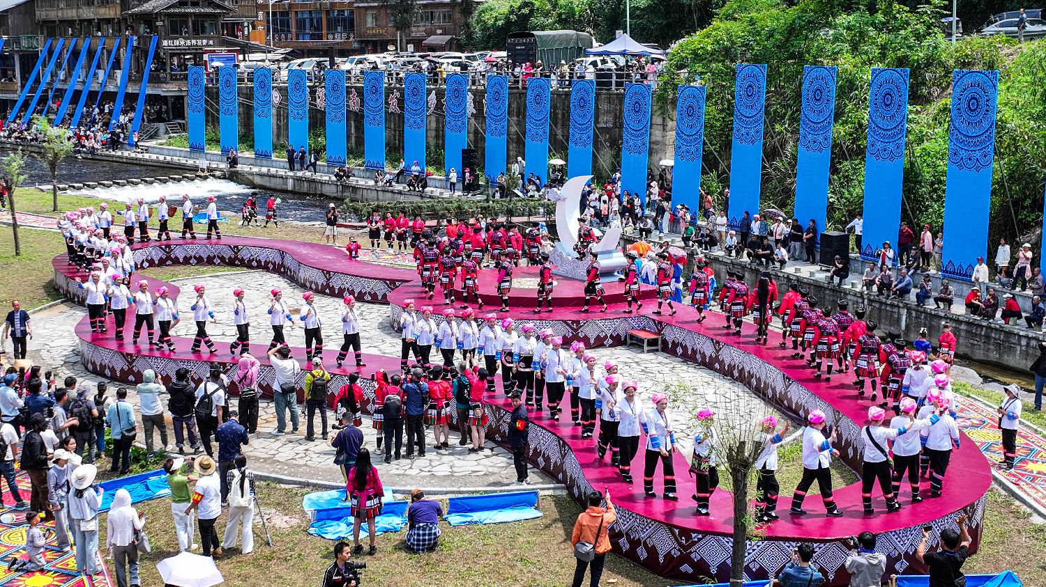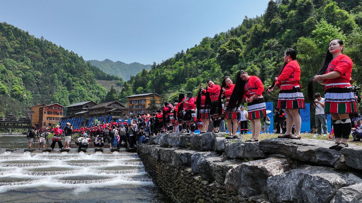 4月19日,中国农历三月初三,广西桂林市龙胜各族自治县黄洛瑶寨举行“三月三”长发节暨凤鸡宴民俗文化节。海内外游客齐聚青山绿水间,赏红瑶长发梳妆、观非遗服饰展演、品龙胜凤鸡盛宴,沉浸式感受多民族文化交融的节庆氛围。图为瑶族女子与中外友人在月亮岛上进行民族服饰走秀。(图片来源:本文图片均来自中新社)