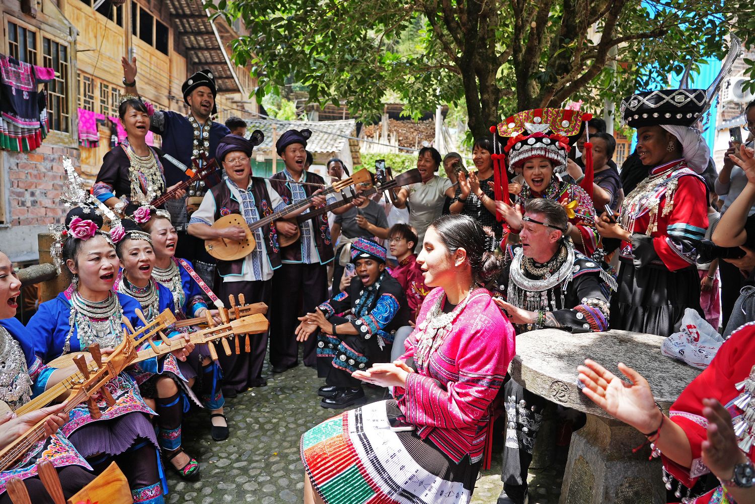 图为当地侗族同胞和外国友人对唱山歌。