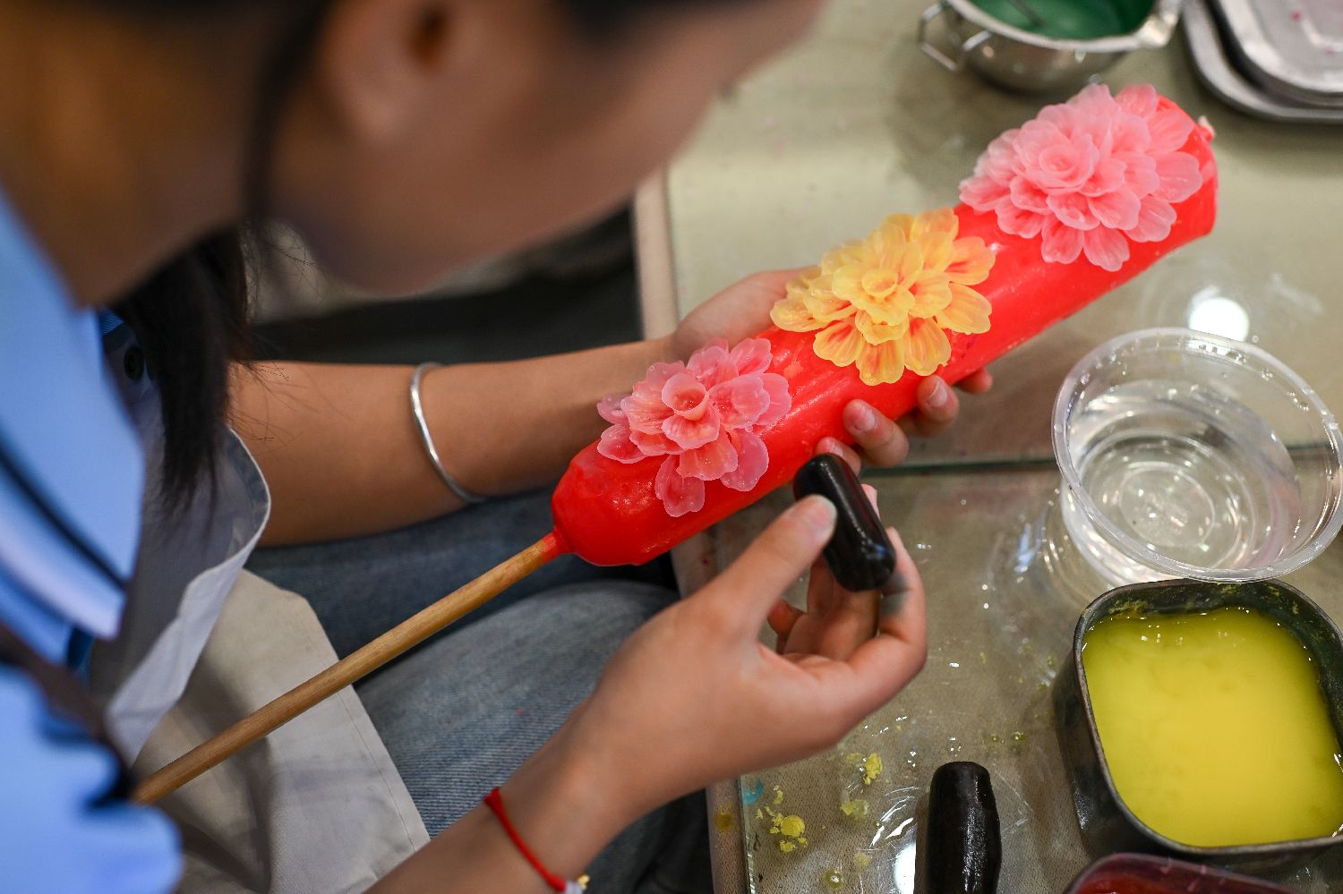 4月20日,学生们在秀山职教中心非遗文创基地学习制作花烛。