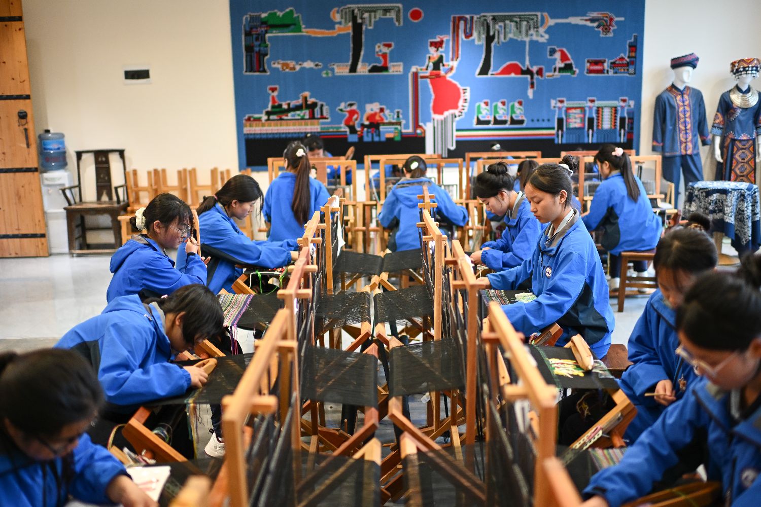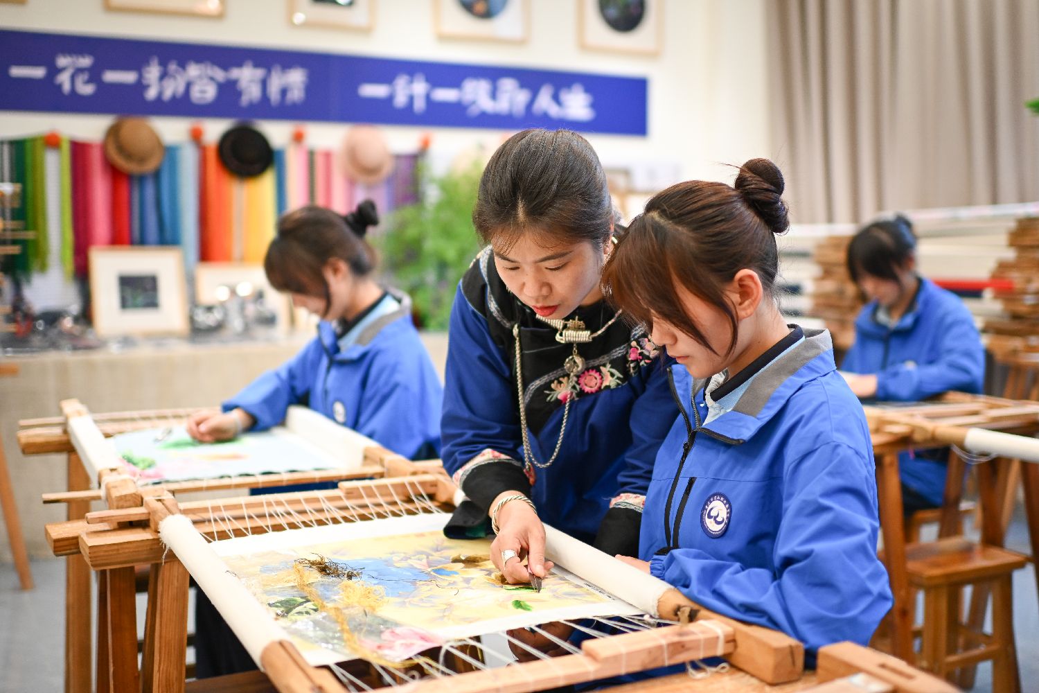 4月20日,学生们在秀山职教中心非遗文创基地学习土家织锦西兰卡普。