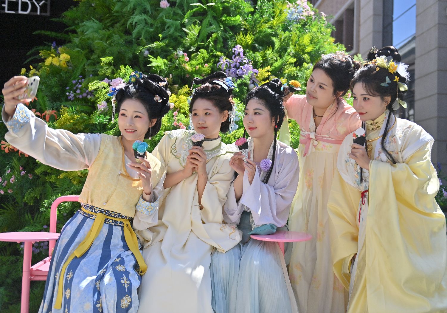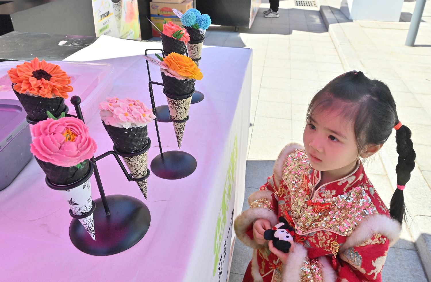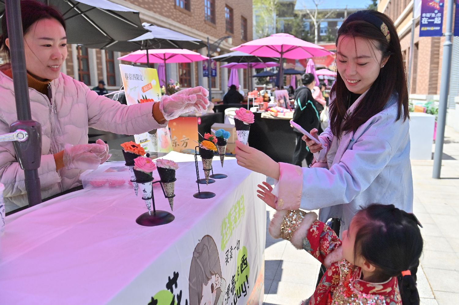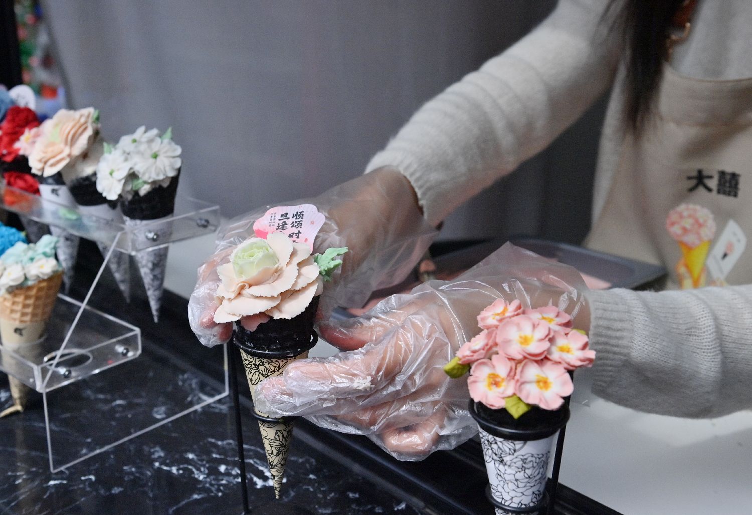 4月21日,在吉林长春,华服爱好者手拿裱花冰淇淋拍照留念。近日,长春一款春日裱花冰淇淋走红。甜品师以奶油、白芸豆粉为原料,现场裱出海棠、绣球等花卉造型,粉嫩逼真,宛如将春天装进甜筒,吸引众多市民打卡尝鲜。(图片来源:本文图片均来自中新社)