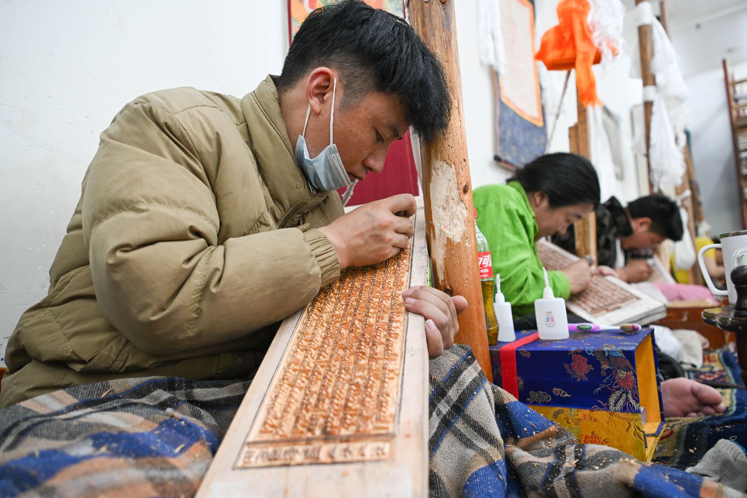 4月21日,西藏雪堆白技工学校手工艺人在雕刻印经板。