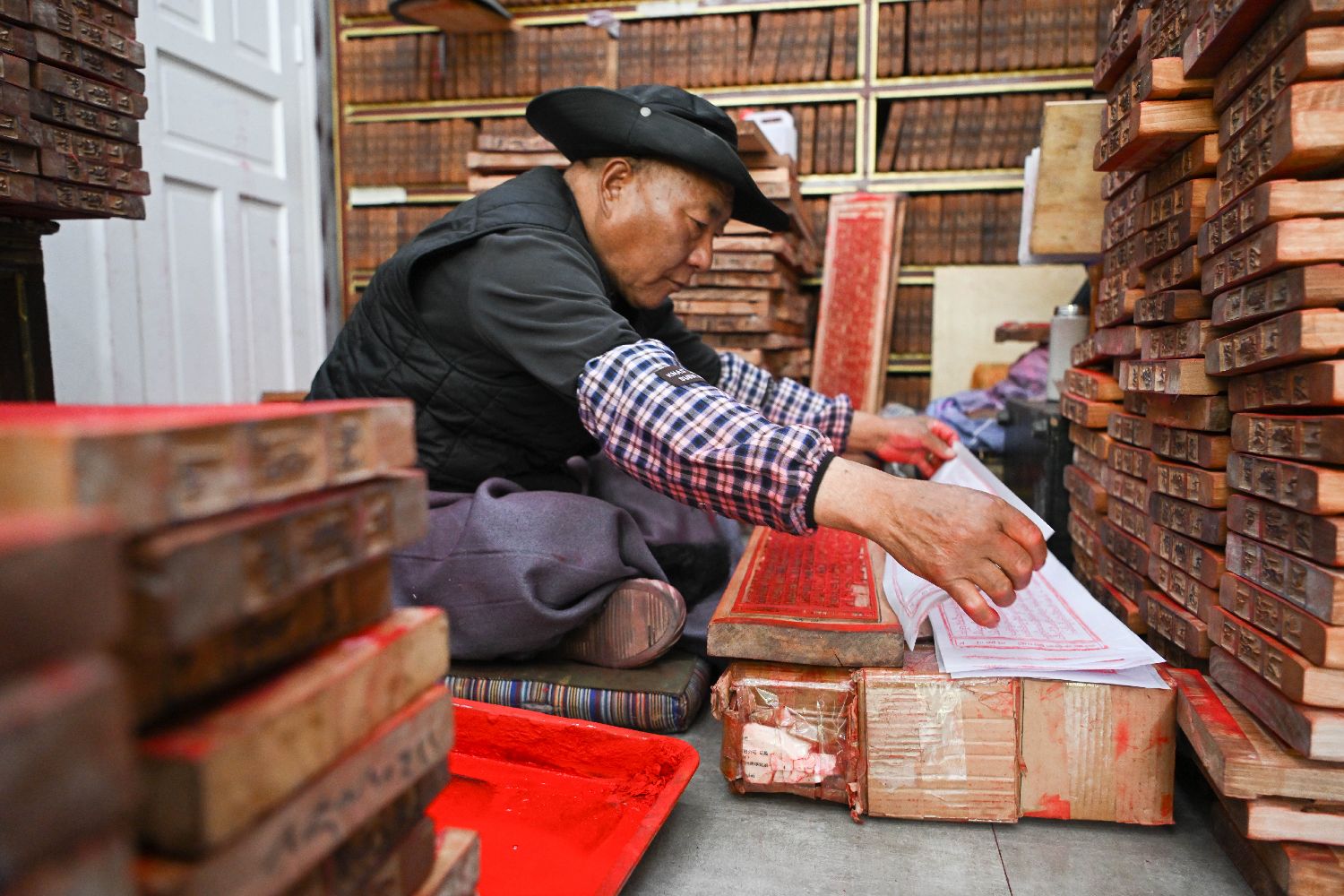 4月21日,西藏雪堆白技工学校手工艺人在印刷《大藏经》。