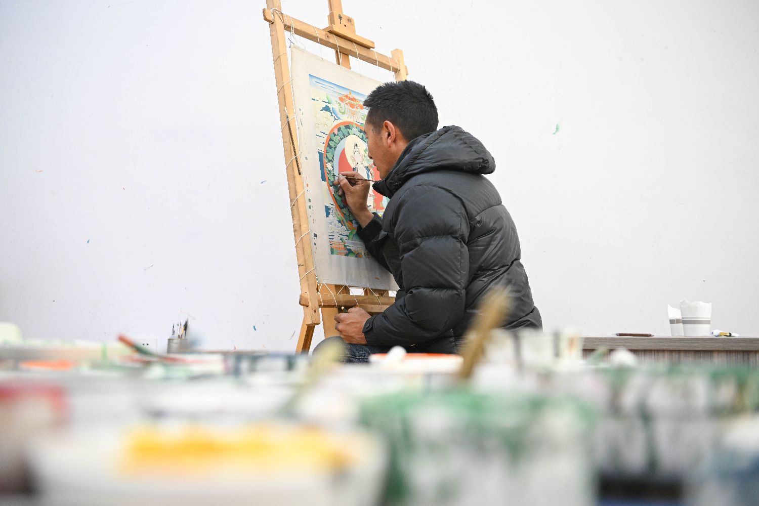 4月21日,西藏雪堆白技工学校手工艺人在绘制唐卡。