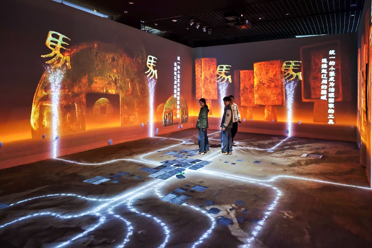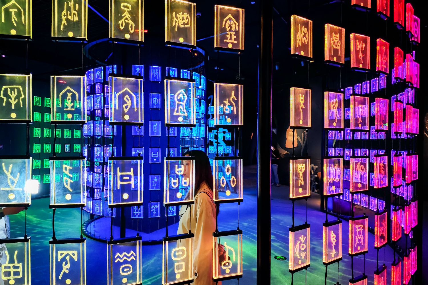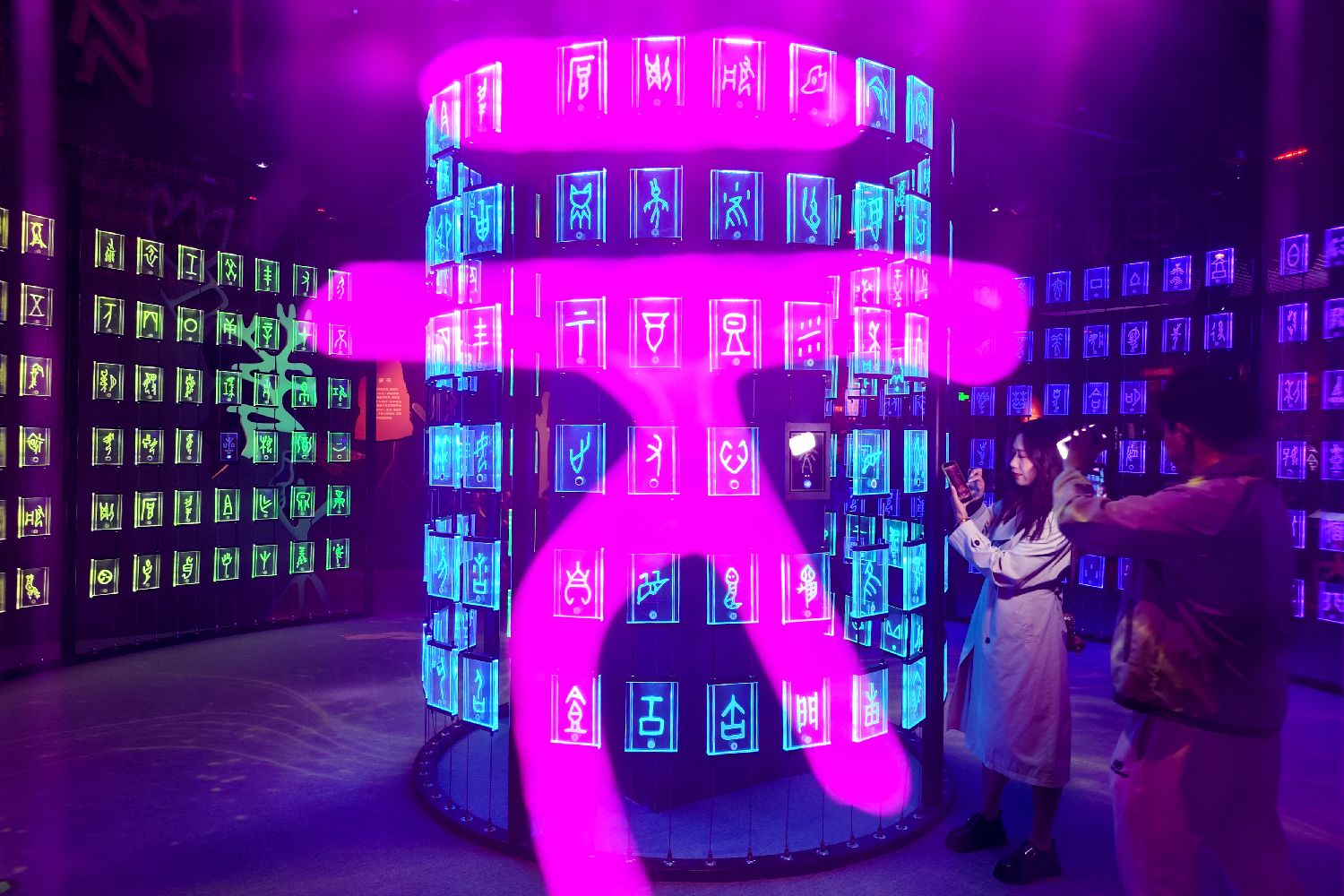 4月21日,天津博物馆,观众在甲骨文沉浸式互动体验数字展拍照。当日,天津博物馆首个全沉浸式数字主题展“契刻流光——甲骨文沉浸式互动体验数字大展”启幕。展览以天津博物馆馆藏珍贵甲骨文物为核心载体,通过全场景沉浸式数字技术、多维度互动体验,让沉睡三千余年的甲骨文字“活”起来,为观众打造一场跨越时空的中华古文字文明盛宴。(图片来源:本文图片均来自中新社)