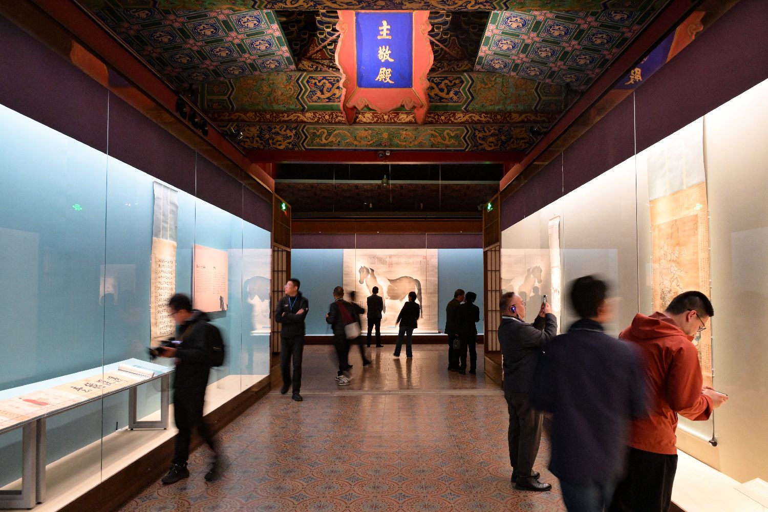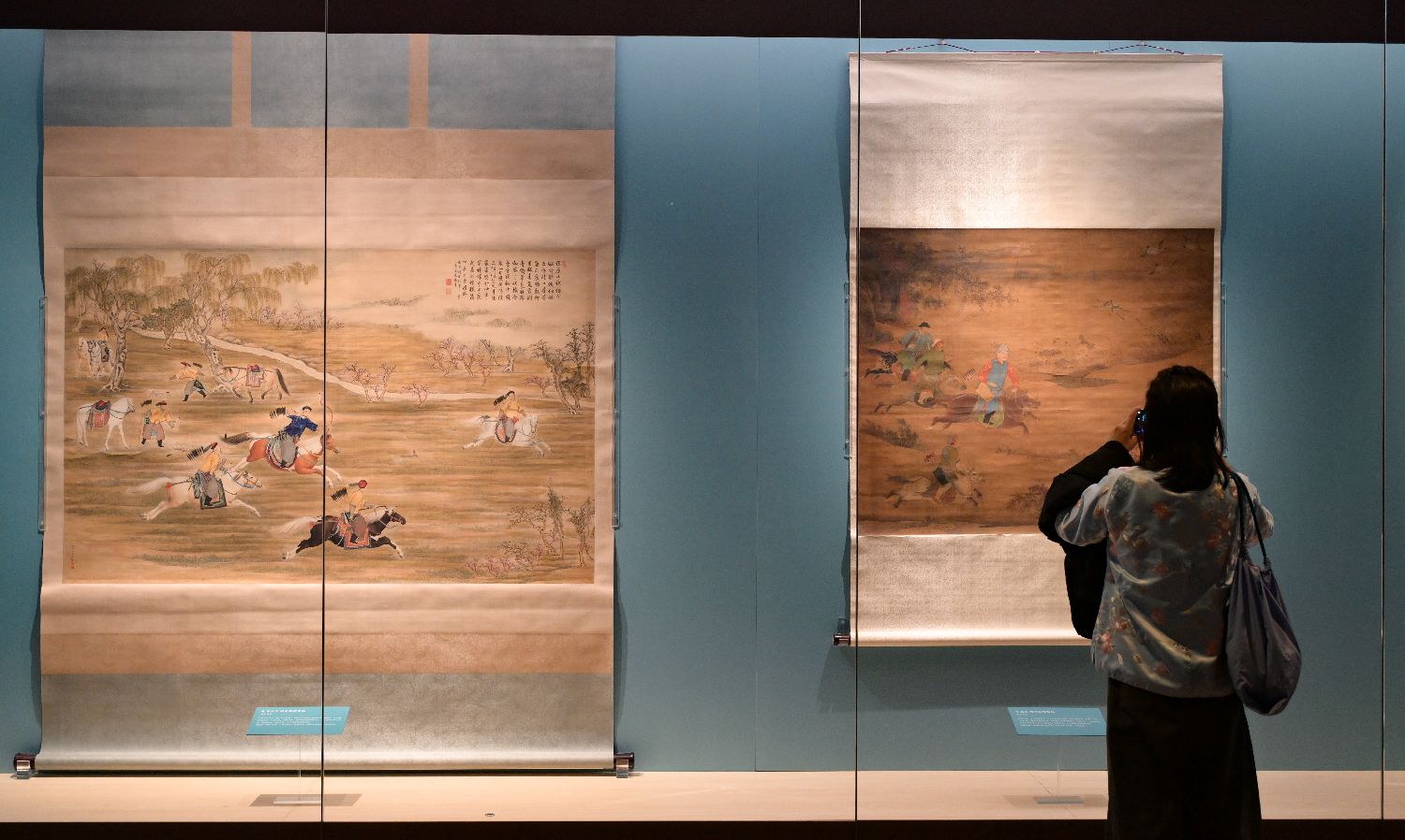 4月21日,“神骏:故宫书画艺术中的马世界”展在北京故宫博物院文华殿开幕。展览选取55件与马相关的院藏珍贵书画,展现马的神骏之姿,展示传统文化深厚魅力。图为参观者在拍摄展出的明代《湖畔射猎图》轴。(图片来源:本文图片均来自中新社)