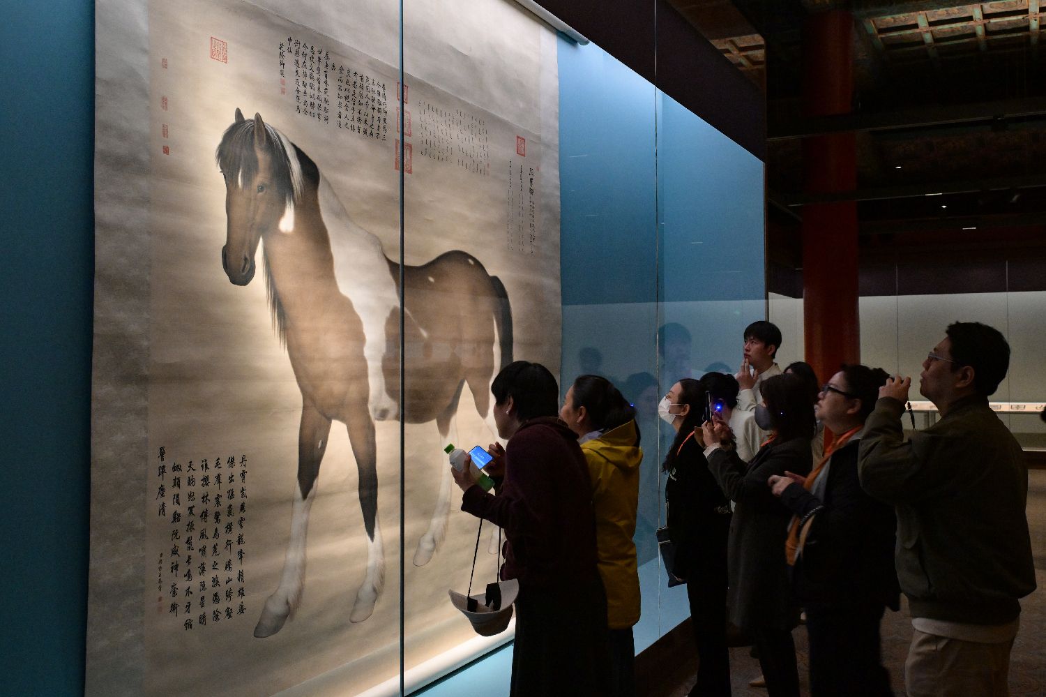 图为观众在观看、拍摄展出的清代郎世宁《阚虎骝图》轴。