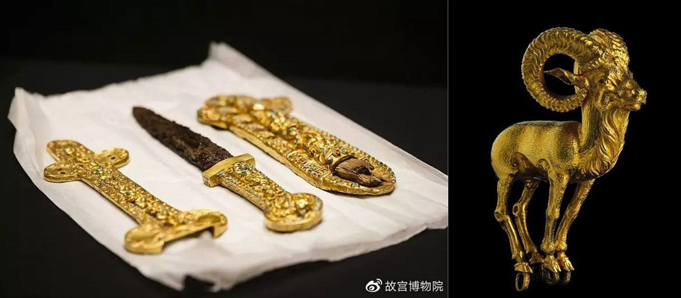 曾在华展出的阿富汗文物。左为镶宝石短剑,右为黄金山羊。(图片来源:故宫博物院微博)
