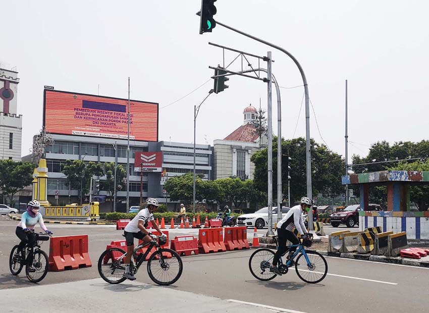 2021年9月11日,印尼首都雅加达的自行车运动爱好者戴着口罩在道路上骑行。(图片来源:中新社)